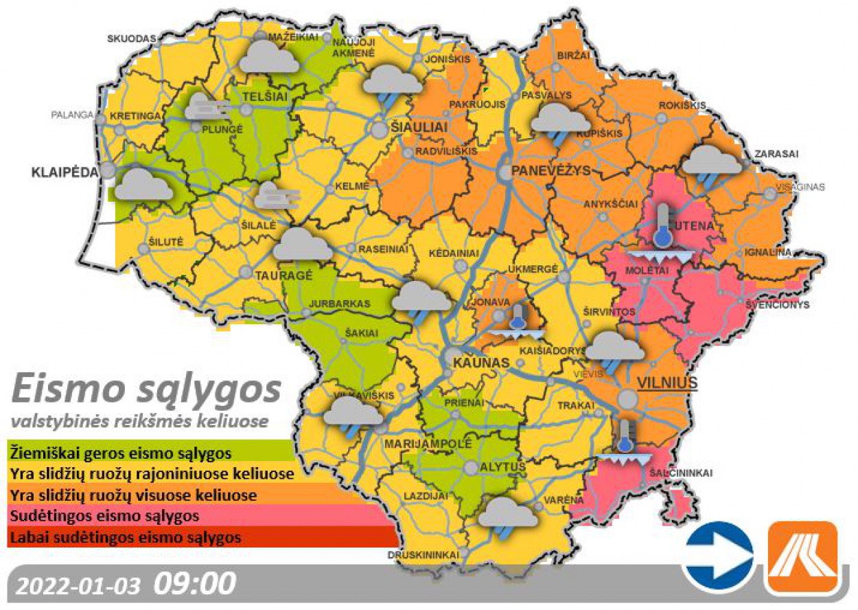 AB „Kelių priežiūra“ slidžius kelių ruožus barsto, tačiau vairuotojų prašome atsižvelgti į kelio dangos būklę ir meteorologines sąlygas bei rinktis saugų, o ne maksimaliai leistiną greitį. Kitur šalyje magistralinių kelių dangos šlapios, krašto ir didesnio intensyvumo rajoniniai keliai taip pat daugiausia šlapi, tik šiaurės vakarinėje dalyje vietomis su šlapio sniego provėžomis. Mažesnio eismo intensyvumo rajoniniai keliai visoje šalyje yra provėžoti, slidūs, vietomis padengti prispausto arba pažliugusio sniego sluoksniu.