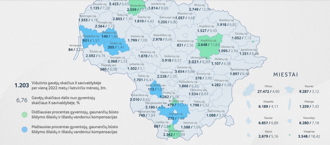 Daugiausiai gyventojų, gaunančių būsto šildymo išlaidų ir išlaidų vandeniui kompensacijas, yra Visagino m. – 18 proc., Akmenės r. – 13 proc., Biržų r. – 12 proc., Druskininkų, Birštono bei Anykščių r. savivaldybėse – beveik 12 proc.