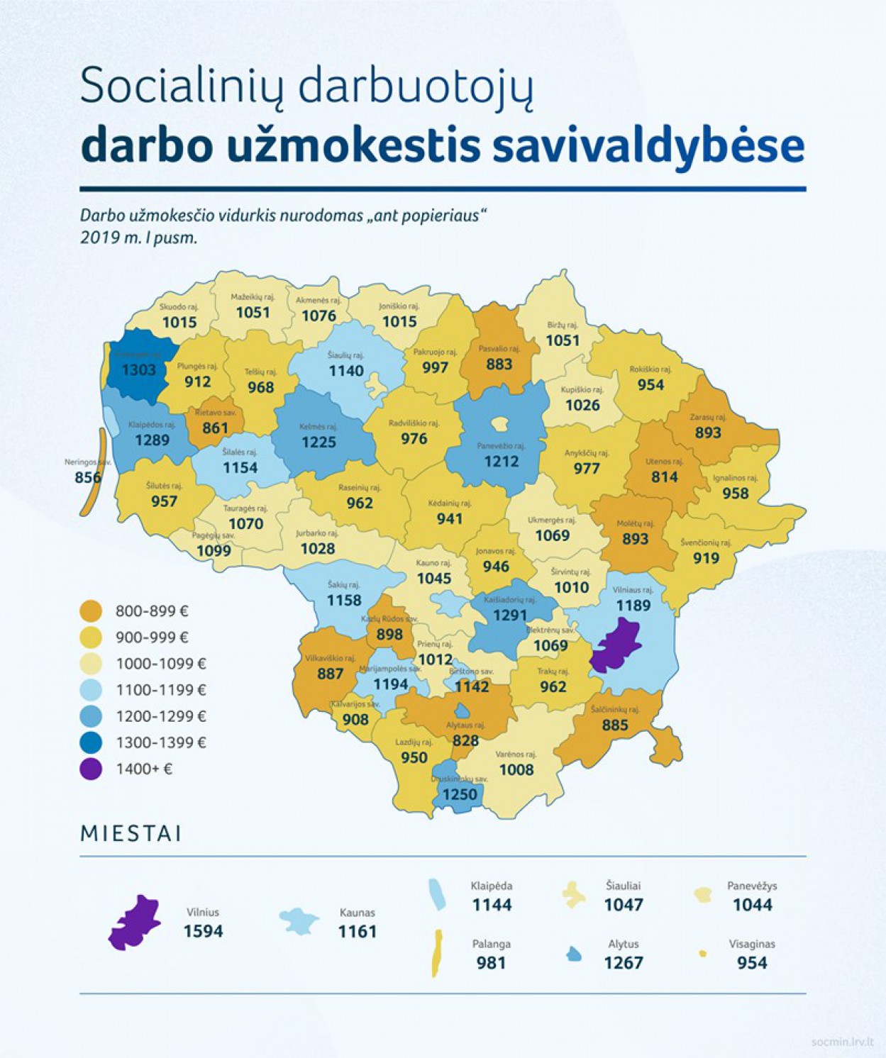 Daugiausiai uždirba Vilniaus savivaldybėje dirbantys socialiniai darbuotojai. Jų algos ,,ant popieriaus" vidurkis siekia 1594 eurus.