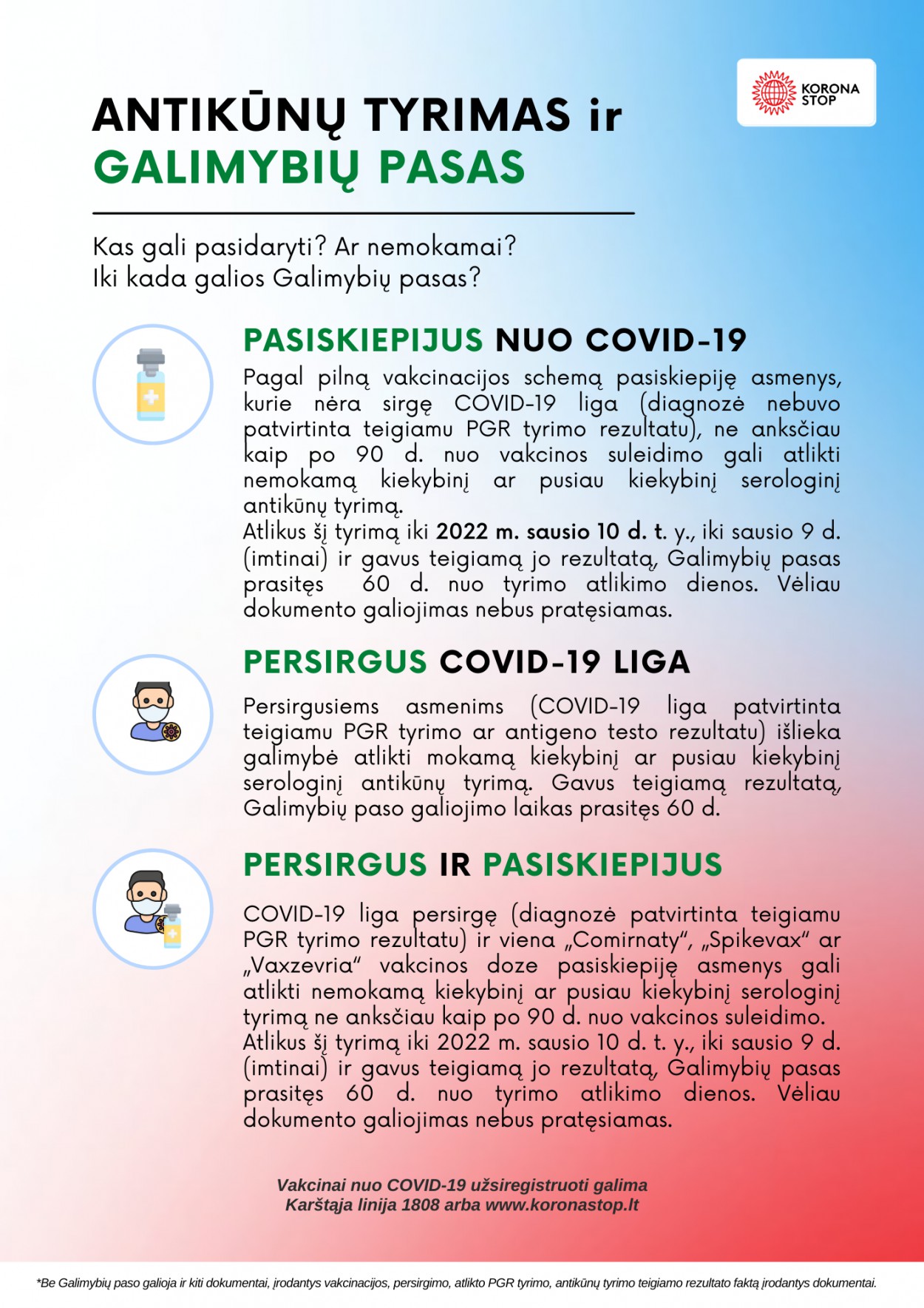 Iki 2022 m. sausio 10 d. atlikus kiekybinį ar pusiau kiekybinį serologinį antikūnų tyrimą, pagal pilną vakcinacijos schemą pasiskiepijęs asmuo gali prasitęsti Galimybių paso galiojimo laiką 60 d. T. y., iki sausio 9 d. (imtinai) atlikus kiekybinį ar pusiau kiekybinį serologinį antikūnų tyrimą ir gavus teigiamą jo rezultatą, Galimybių pasas prasitęs 60 d. nuo tyrimo atlikimo dienos.