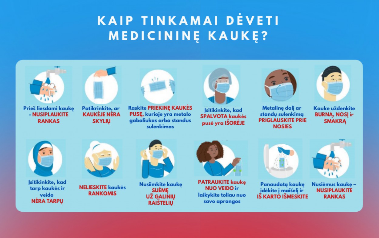 Siekiant užkirsti kelią koronaviruso plitimui, Sveikatos apsaugos ministerija (SAM) ragina saugoti savo ir aplinkinių sveikatą. Be to, kad reikėtų laikytis saugaus atstumo nuo kitų, vengti kontaktų, nuolat plauti rankas, labai svarbu tinkamai ir saugiai dėvėti veido apsauginę priemonę. Ministerija pabrėžia svarbiausius dalykus, kurių negalima pamiršti prieš užsidedant, nešiojant ir nusiėmus medicininę veido kaukę.