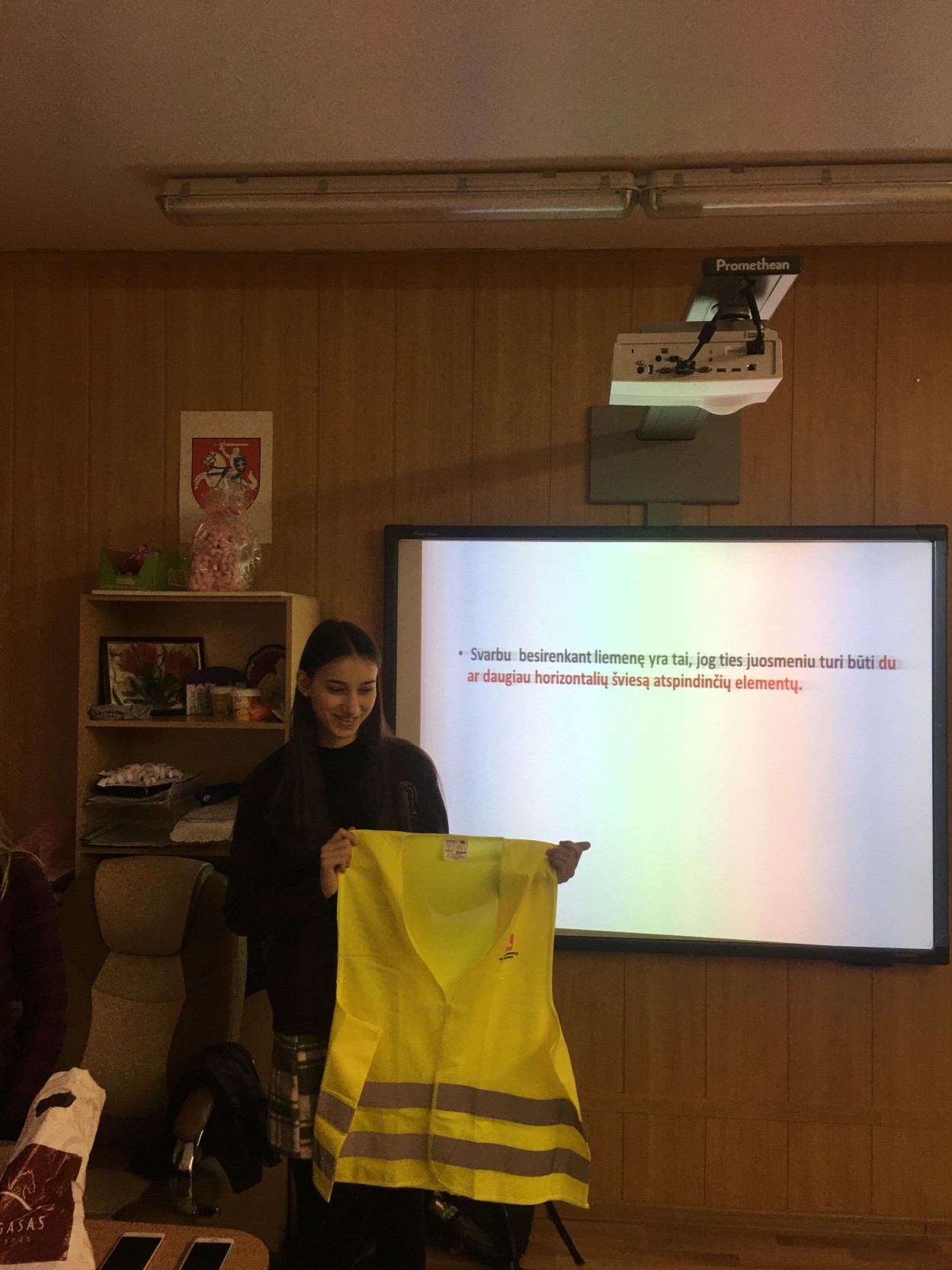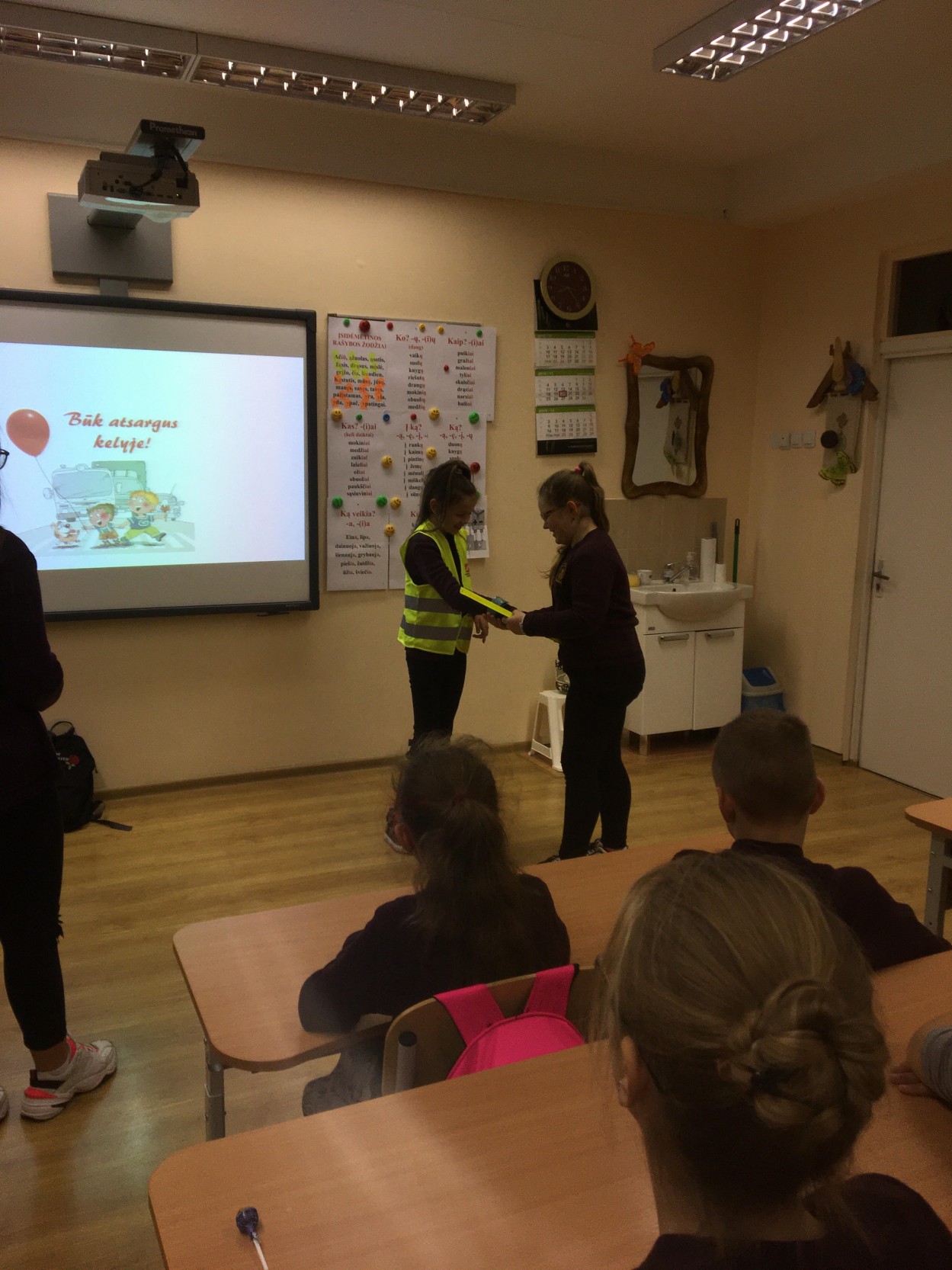 Mokiniai pakartojo saugaus eismo taisykles. Sužinojo, kaip svarbu dėvėti atšvaitus tamsiu paros metu, kaip svarbu būti matomam vairuotojams. Mokiniai praktiškai mokėsi užsidėti atšvaitą. Pakartojo saugaus eismo taisykles.