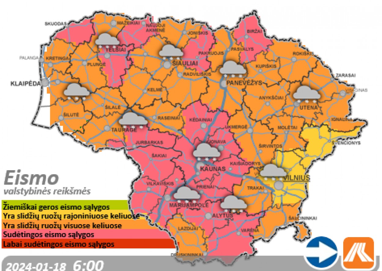 Dėl besitęsiančio snygio ir pustymo sudėtingos eismo sąlygos visoje šalyje, Vilkaviškio rajone krašto keliai Nr.186 (Kybartai–Vištytis), Nr.185 (Vilkaviškis–Gražiškiai), Nr.200 (Kalvarija–Gražiškiai–Vištytis) ir rajoninis kelias Nr. 5102 (Virbalis–Vištytis) sunkiai pravažiuojami. Tauragės ir Ignalinos rajonuose eismo sąlygas sunkina plikledis.