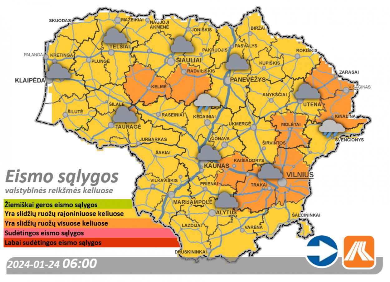 Eismo sąlygas sunkina susiformavęs plikledis Kaišiadorių, Vievio, Ignalinos, Molėtų, Švenčionių ir Zarasų rajonuose, čia keliai slidus. Radviliškio rajone lijundra. Vairuotojų prašome atkreipti dėmesį į tai, kad eismo sąlygas sunkina lijundra, todėl neskubėkite, nedarykite staigių manevrų. Vievio, Kėdainių ir Švenčionių rajonuose lietus.