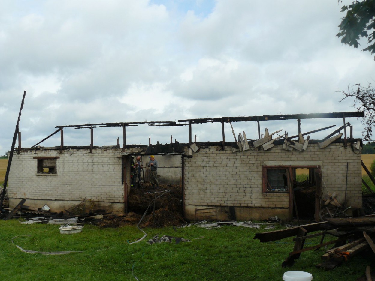Atvykus atvira liepsna degė ūkinis pastatas. Gaisro metu nudegė stogas ir perdanga, sudegė viduje buvę 12 vnt., po 120 kg., šieno rulonų ir dalis šiaudų. Labiausiai tikėtina gaisro kilimo priežastis – žaibo iškrova.