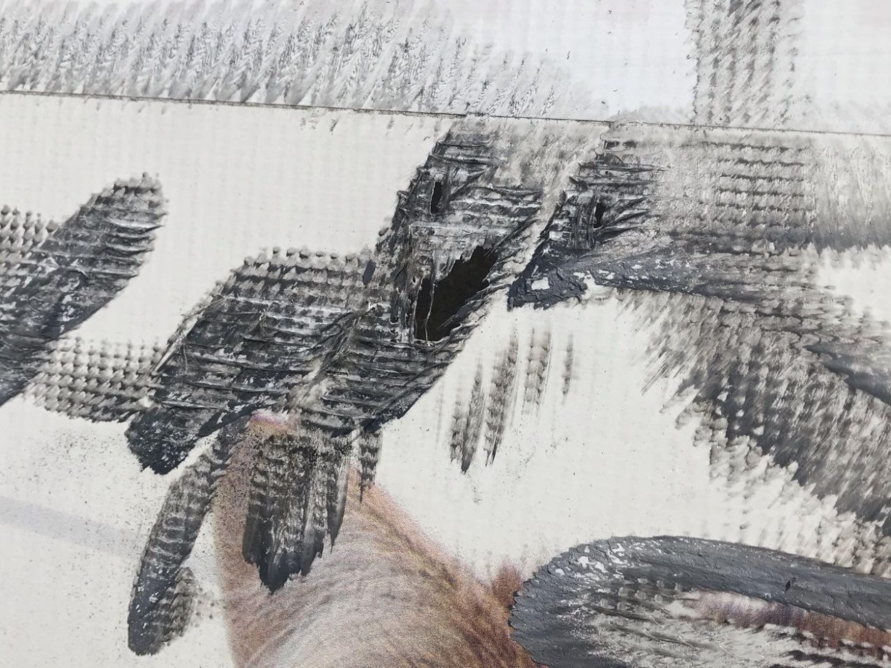 Nors sunku pasakyti, kokiu tiksliai būdu siena buvo apgadinta, spėjama, jog tentas pradegintas aktyviai jį brūžinant apvaliu įrankiu.