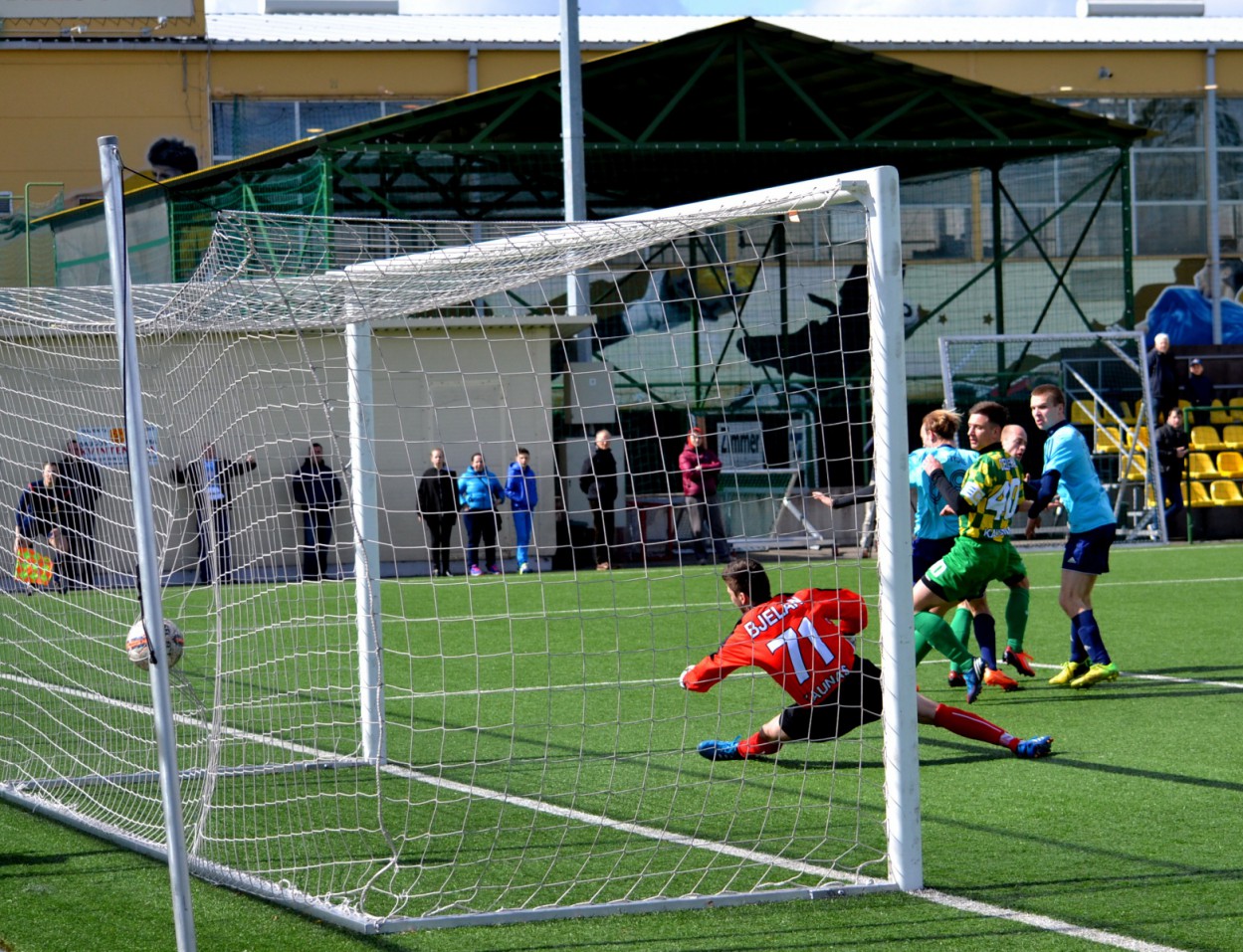 Pirmoje rungtynių pusėje nei vienai komandai ryškios teritorinės persvaros įgyti nepavyko, tačiau aikštelės šeimininkai turėjo kelias progas pasižymėti. Realiausia proga jie taip ir nepasinaudojo, kai po greitos atakos varžovas smūgiavo nuo artimo atstumo, bet šįkart pagirtinai sužaidė „Lietava“ komandos vartininkas Laurynas Vertelis.