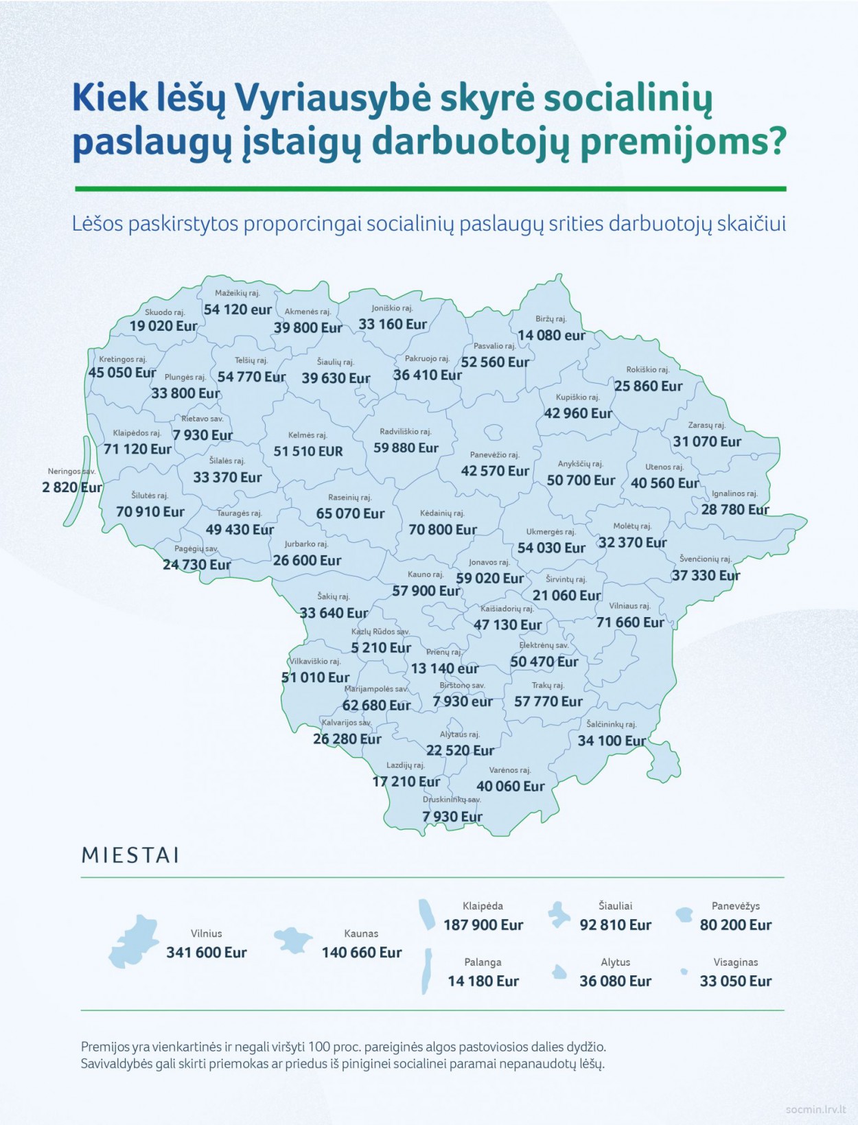 Savivaldybėms paskirstyta 2,9 mln. eurų, kuriuos Vyriausybė skyrė savivaldybių pavaldumo socialinių paslaugų įstaigų darbuotojų premijoms už ypač svarbių užduočių vykdymą ekstremaliosios situacijos ir karantino laikotarpiu.