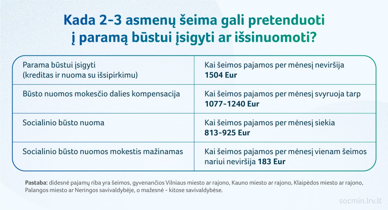 Primename, kad gyventojai gali pasinaudoti parama būstui įsigyti ar išsinuomoti, priklausomai nuo pajamų ir turimo turto dydžio: