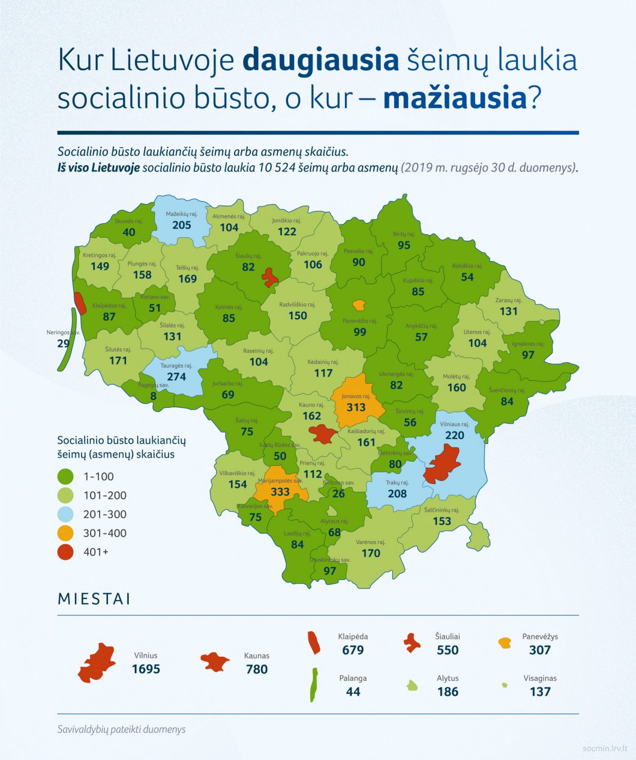 Mažiausiai socialinio būsto laukiančiųjų yra Birštono, Kazlų Rūdos, Neringos, Pagėgių rajono, Palangos miesto, Skuodo rajono savivaldybėse. Skaičiuojama, kad šiose teritorijose yra ne daugiau nei po 50 šeimų arba asmenų, kuriems reikalingas socialinis būstas.