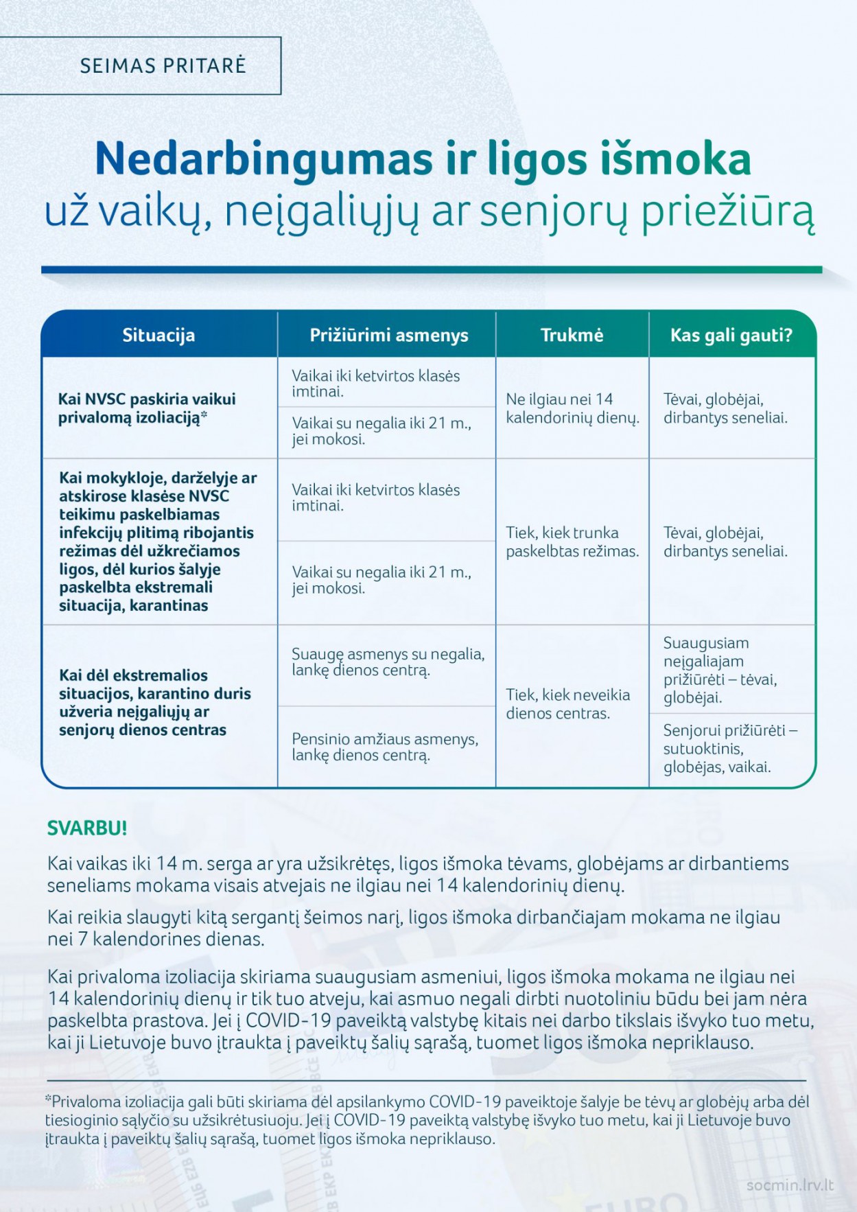 Privaloma izoliacija vaikui gali būt paskiriama dviem atvejais – kai vaikas be tėvų ar globėjų lankėsi koronaviruso paveiktoje šalyje arba kai turėjo tiesioginį sąlytį su sergančiuoju. Išmoka nepriklausytų, jeigu vaikas į koronaviruso paveiktą šalį išvyko, kai ši šalis jau buvo įtraukta į paveiktų valstybių sąrašą.