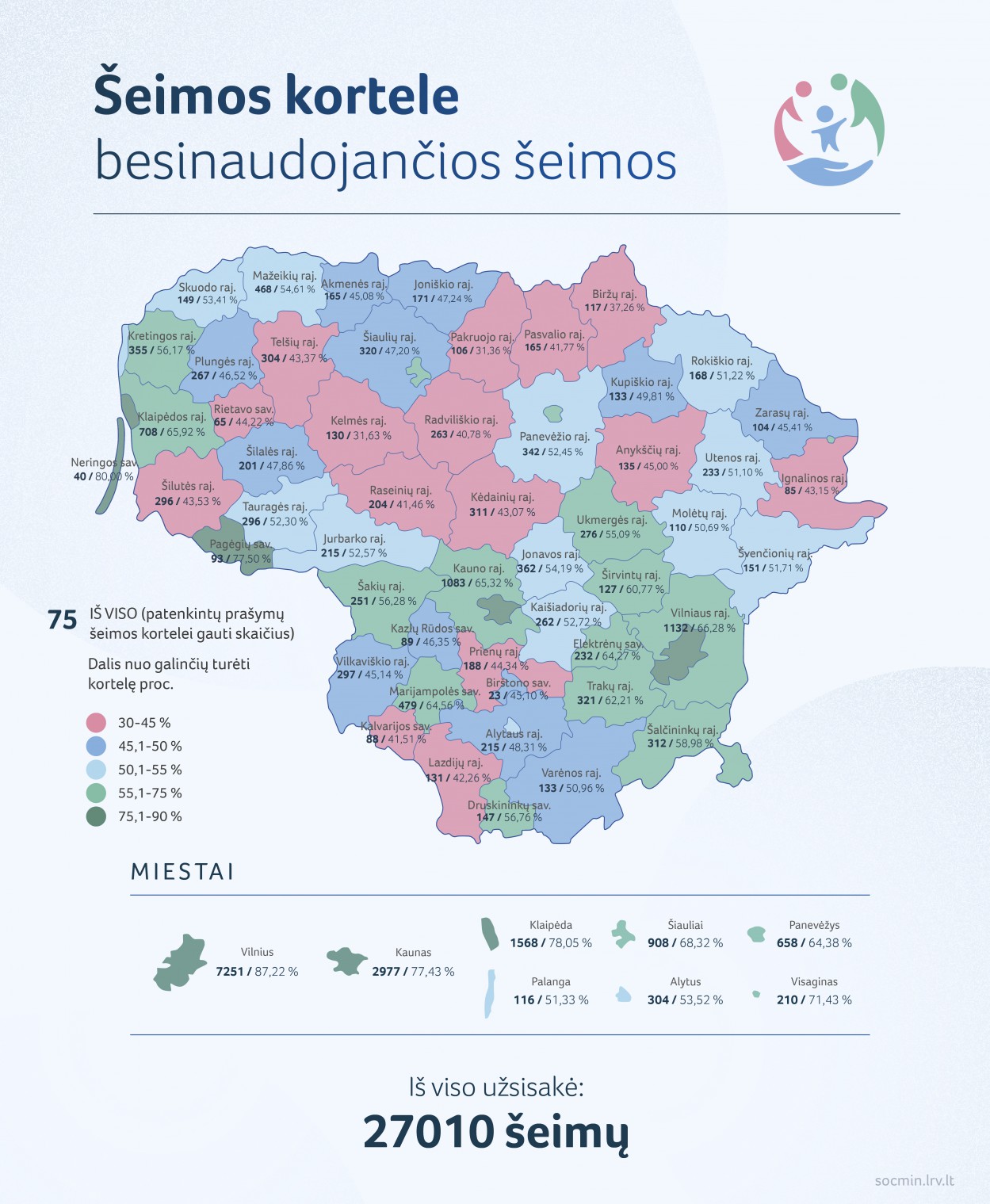 Šeimos kortelės populiarumu išsiskiria Vilniaus miesto savivaldybė – šia kortele naudojasi net 87 proc. savivaldybėje gyvenančių ir teisę į Šeimos kortelę turinčių šeimų. Kituose didžiuosiuose miestuose ji taip pat tampa vis populiaresnė: Klaipėdos miesto – 78 proc., Kauno miesto – 77 proc., Šiaulių miesto – 68,32 proc. Labai džiugina mažųjų savivaldybių patirtys, kur išsiskiria Neringos – 80 proc., Pagėgių – 77,5 proc., Visagino – 71 proc., Marijampolės – 64,56 proc., Elektrėnų – 64,27 proc. savivaldybės. Didžiausias pokytis per šiuos metus įvyko Rokiškio ir Molėtų savivaldybėse, kur kortelių turinčių šeimų dalis išaugo beveik 5 proc. punktais.