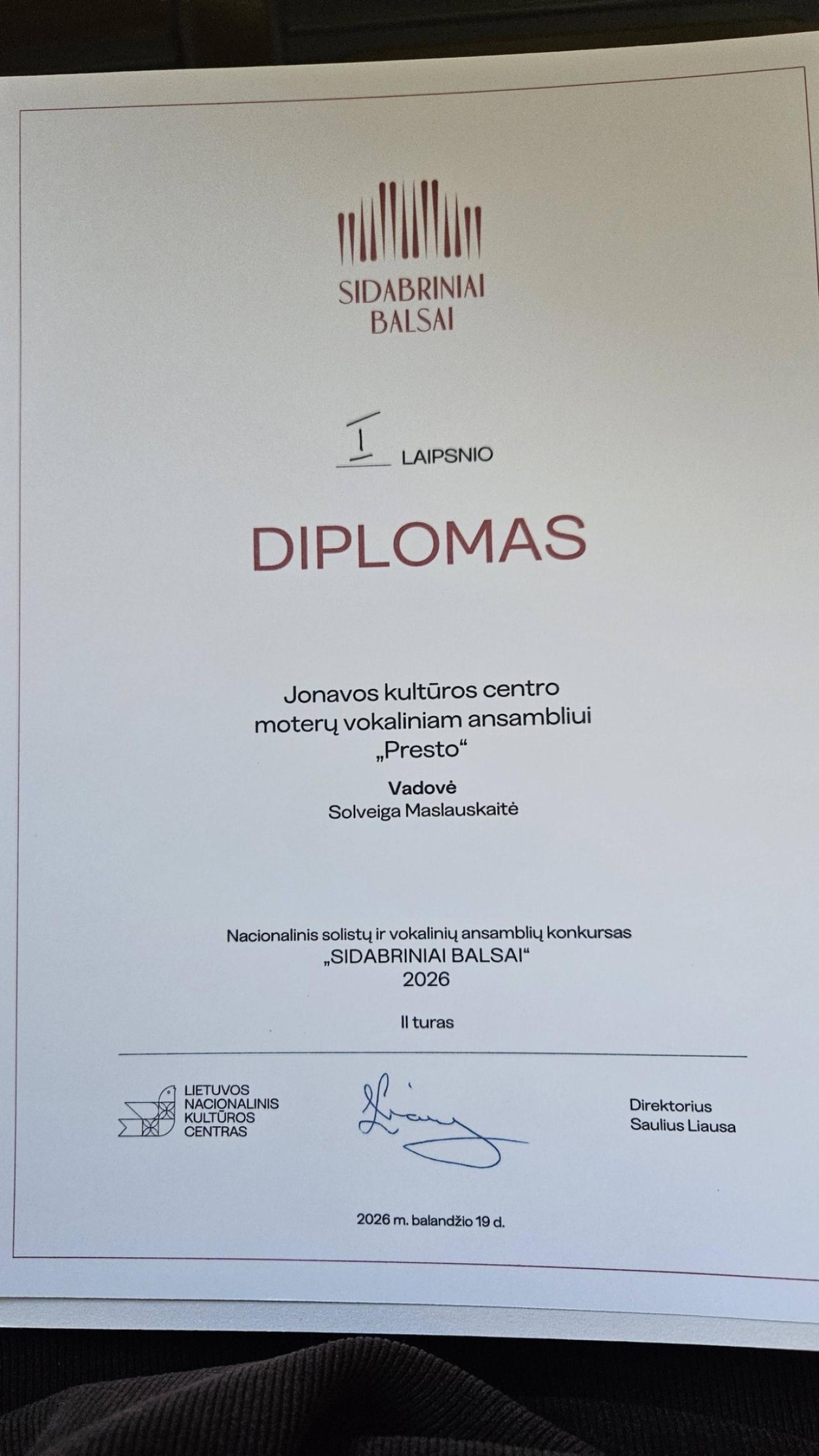 Džiaugiamės ir didžiuojamės ansamblio narių profesionalumu, darniu skambesiu bei atsakingu darbu, atnešusiu šį reikšmingą įvertinimą.