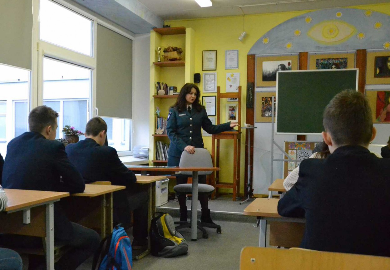 Jelena Pališkienė, Jonavos rajono PK Viešosios policijos skyriaus Prevencijos poskyrio specialistė aiškino, kokie reikalavimai keliami siekiantiems tapti policijos pareigūnais. Viešnia akcentavo, kad būsimam pareigūnui labai svarbu gera sveikata, fizinis pasirengimas ir nepriekaištinga stojančiojo reputaciją, nes kandidatas yra tikrinamas pagal vidaus reikalų įstaigų reikalavimus. Mokinių nuostabai, į klausimą, ar teko darbe panaudoti ginklą, atsakymas buvo „taip“.