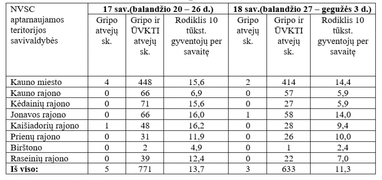 Nacionalinio visuomenės sveikatos centro (NVSC) prie Sveikatos apsaugos ministerijos Kauno departamentas informuoja, kad 18-osios metų savaitės duomenimis sergamumas gripu ir ūminių viršutinių kvėpavimo takų infekcijomis (ŪVKTI) Kauno apskrityje siekia 11,3 atvejus 10 000 gyventojų per savaitę. Didžiausias sergamumas registruotas Kaune – 14,4 atvejai 10 000 gyventojų per savaitę. Registruotas sergamumas Jonavos rajone – 14,0 atvejų 10 000 gyventojų per savaitę. Mažiausiai serga Birštone – 2,4 atvejai 10 000 gyventojų per savaitę.