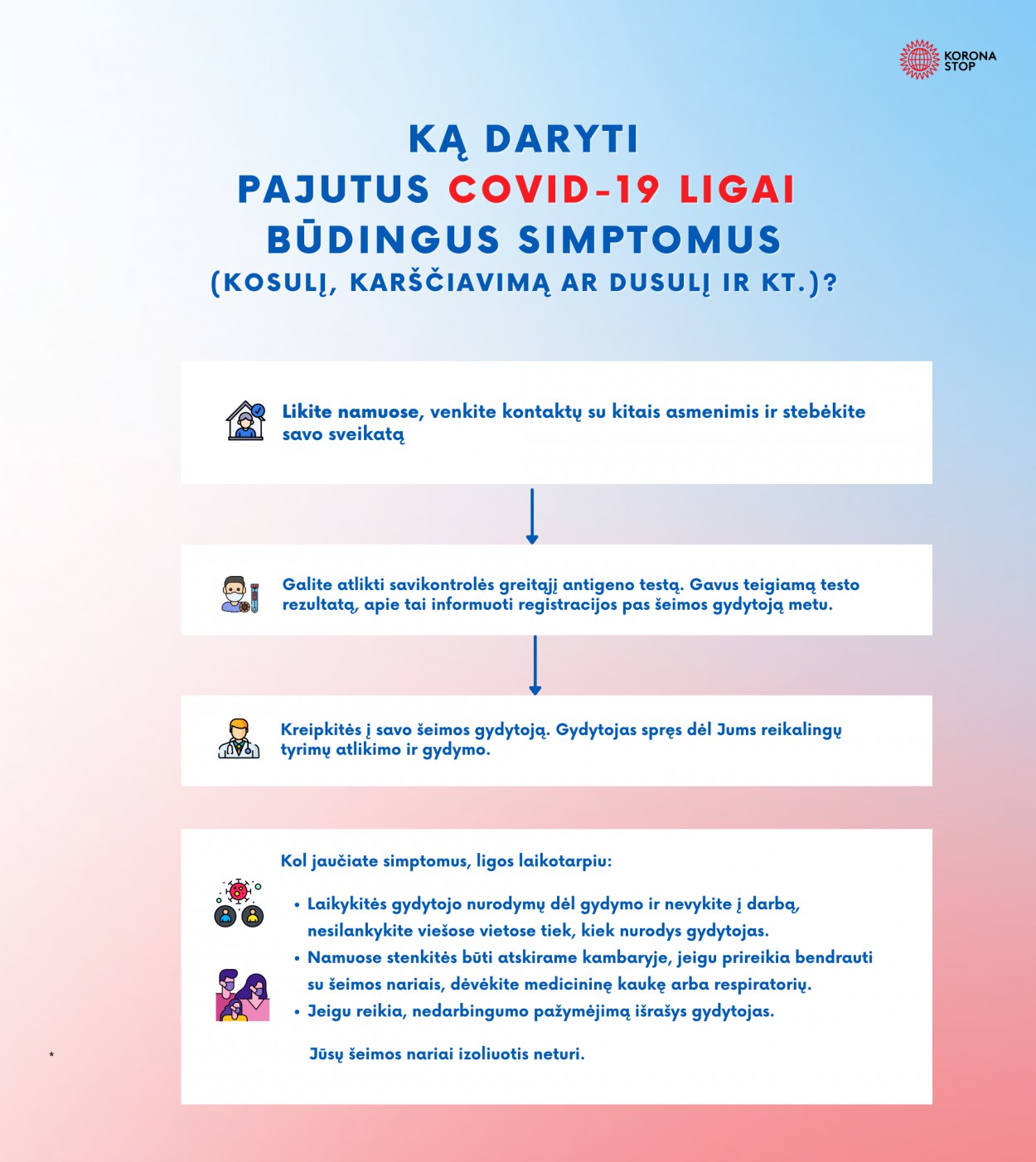 Viena svarbiausių COVID-19 plitimo valdymo priemonių yra ta, kad pajutus ūmios viršutinių kvėpavimo takų infekcijos požymius (kosulį, karščiavimą, galvos skausmą, pykinimą, dusulį ir pan.), būtina likti namuose, neiti į darbą ar ugdymo įstaigą, į kitas žmonių susibūrimo vietas, kreiptis konsultacijos į savo šeimos gydytoją. Jei yra galimybė, kol yra simptomai, rekomenduojama būti atskiroje patalpoje nuo kitų šeimos narių.