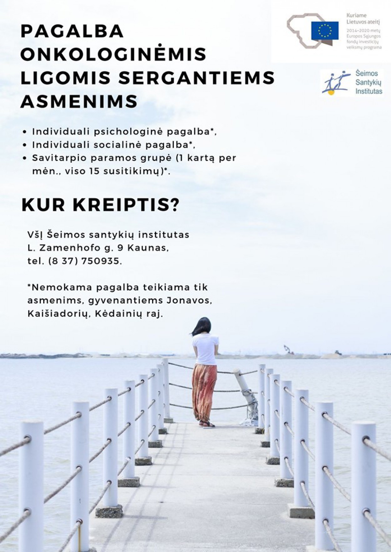 VšĮ Šeimos santykių institutas kartu su partneriais įgyvendina Europos socialinio fondo lėšomis finansuojamą projektą ir kviečia Jonavos, Kaišiadorių ir Kėdainių rajonų gyventojus, sergančius onkologinėmis ligomis, registruotis į nemokamas individualias konsultacijas bei dalyvauti kartą per mėnesį organizuojamose savitarpio paramos grupėse.