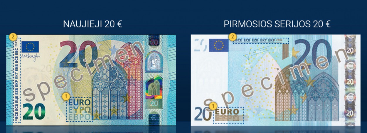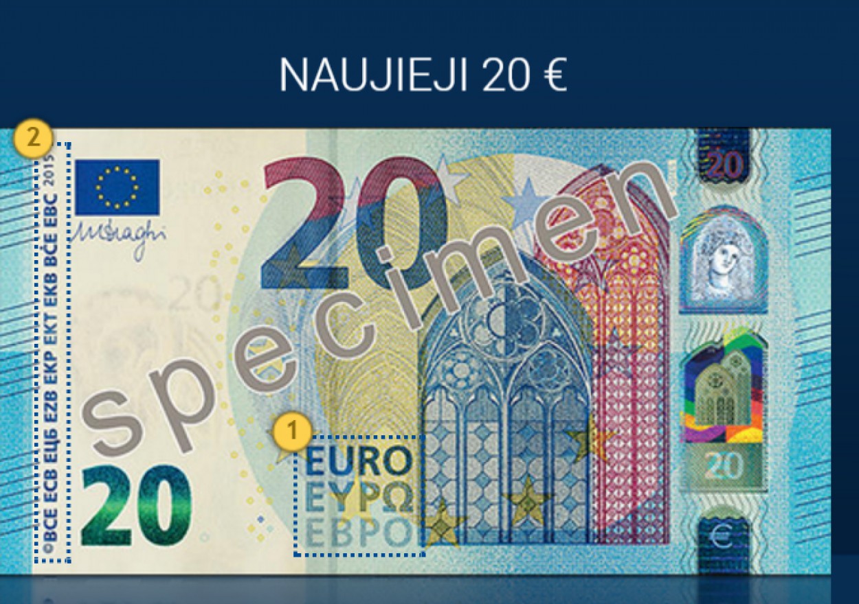 Šiandien Lietuvoje ir dar aštuoniolikoje euro zonos šalių į apyvartą išleidžiamas naujasis 20 eurų banknotas. Jame panaudota banknotų apsaugos naujovė – langelis su portretu hologramoje.