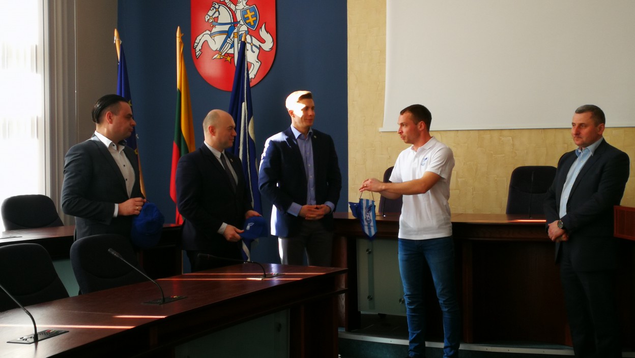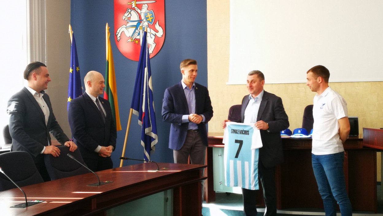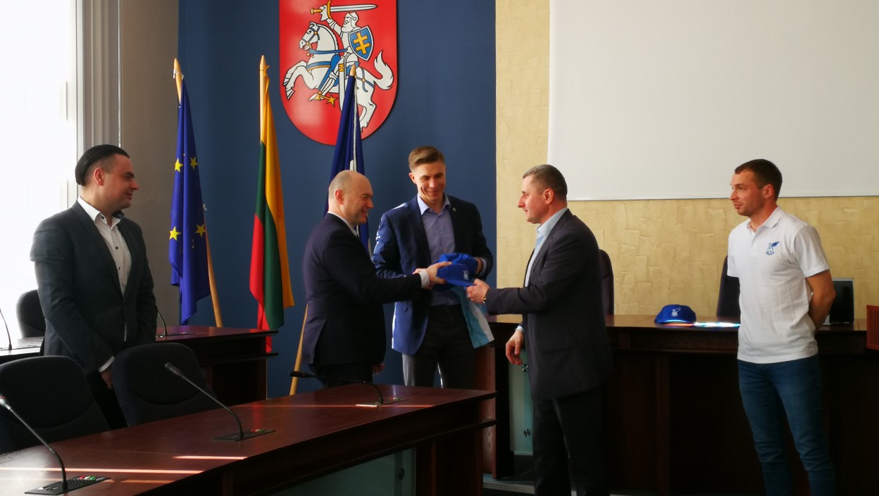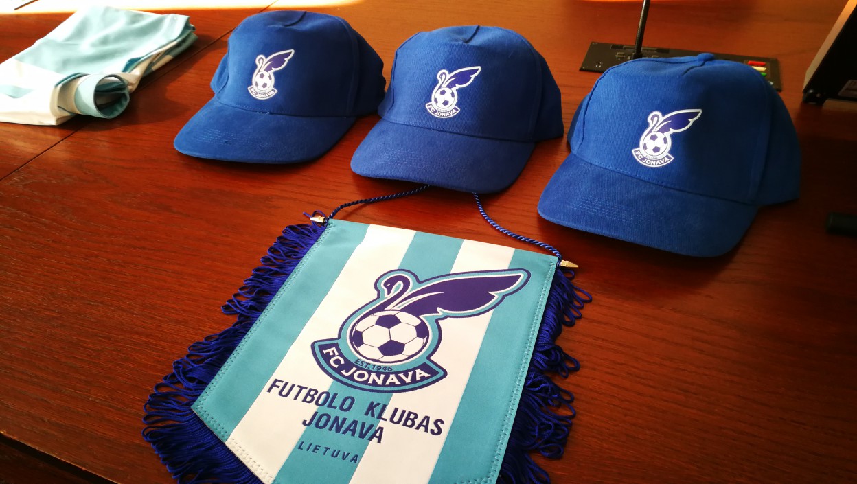 Simboliškai miesto valdžiai įteikti FK „Jonava“ suvenyrai – marškinėliai ir kepuraitės.