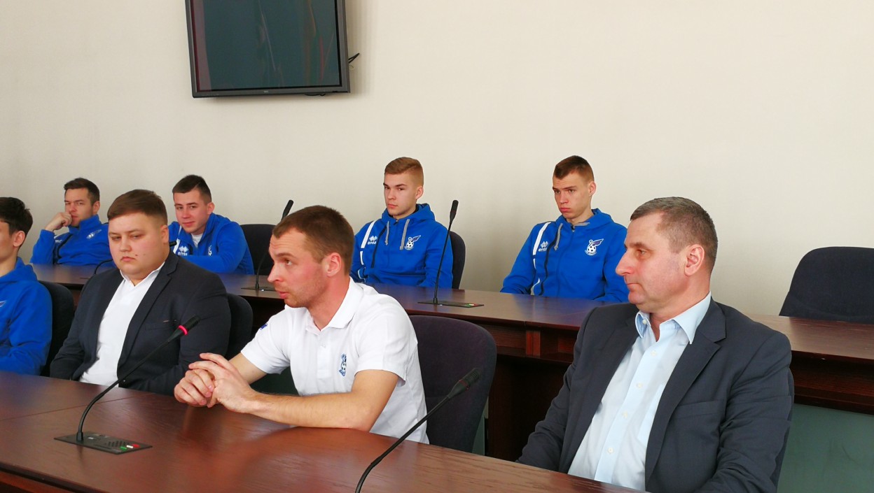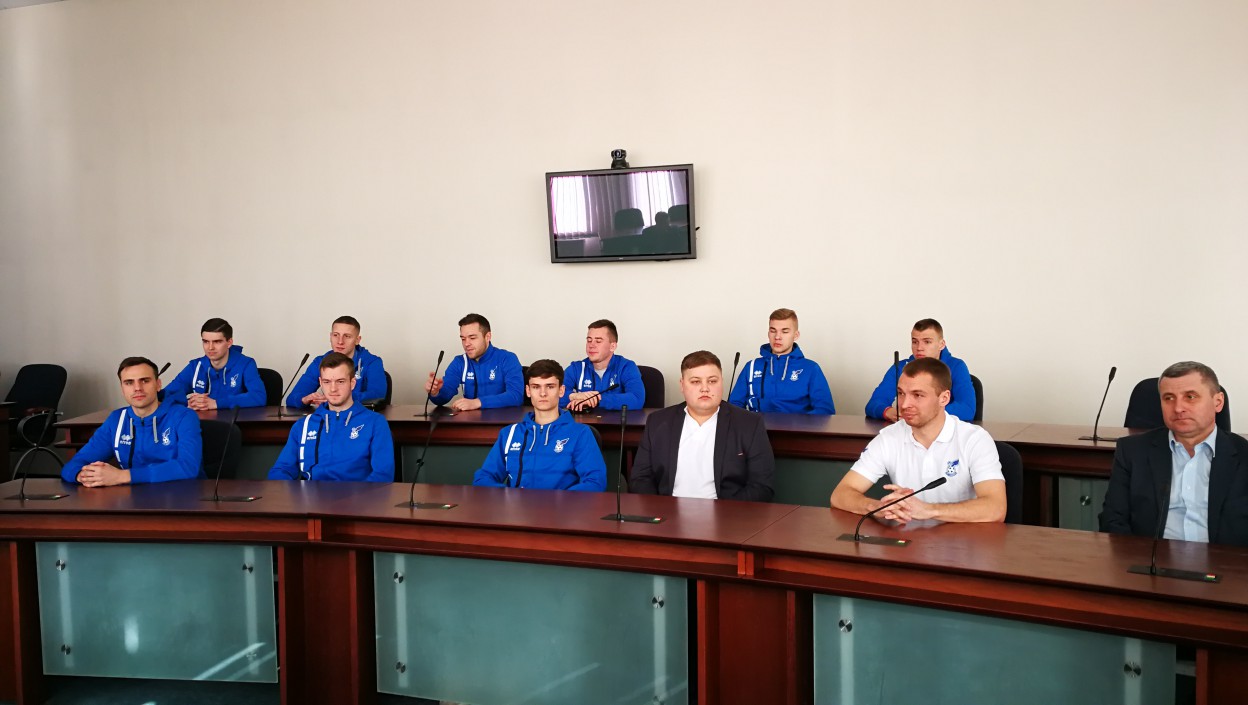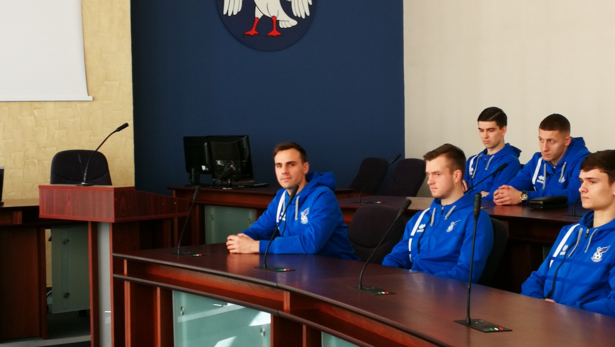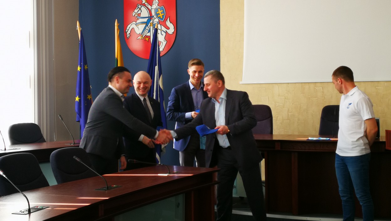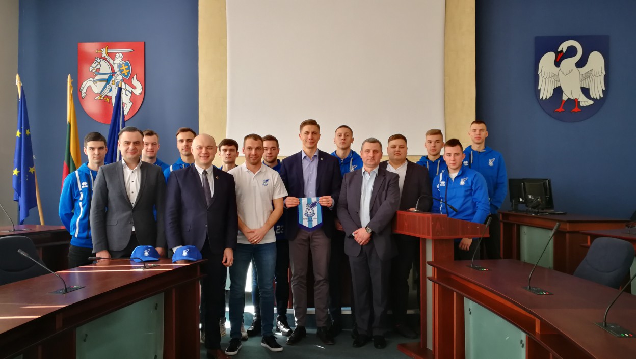 Simboliškai miesto valdžiai įteikti FK „Jonava“ suvenyrai – marškinėliai ir kepuraitės.