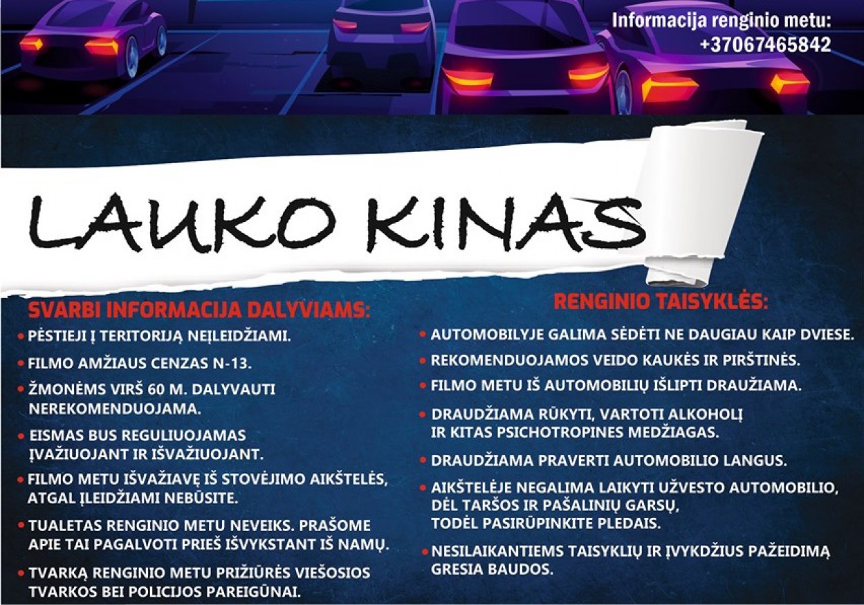 Kino filmai rodomi Jonavos sporto arenos automobilių aikštelėje. Renginys nemokamas, tačiau jo metu žiūrovai laikosi griežtų karantino reikalavimų, reguliuojamas automobilių eismas, tvarką prižiūri savivaldybės viešosios tvarkos pareigūnai.