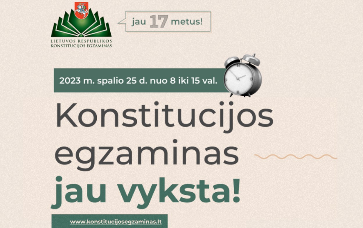 Šiandien nuo 8.00 iki 15.00 val. (Lietuvos laiku) laikomas Konstitucijos egzaminas. Šiemet egzaminas skirtas ne tik Konstitucijos dienai, bet ir Konstitucinio Teismo 30-mečiui paminėti. Teisingumo ministerija kartu su egzamino globėju Lietuvos Respublikos Prezidentu Gitanu Nausėda kviečia visus dalyvauti unikalioje pilietiškumo, teisinio švietimo ir visuotinio žinių patikrinimo iniciatyvoje.
