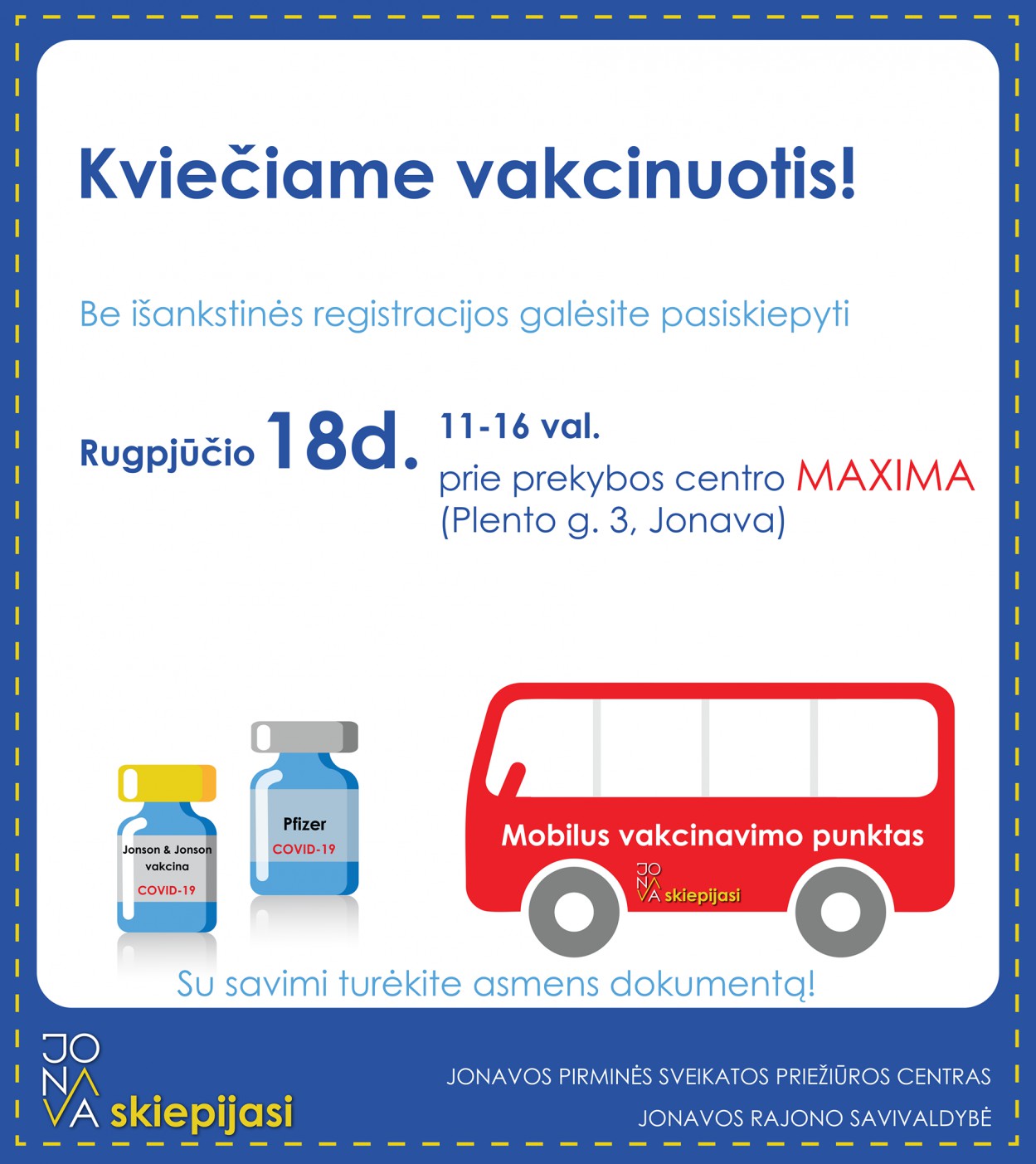 Šiandien, nuo 11.00 iki 16 val., prie „Maxima“ parduotuvių esančiuose mobiliuose vakcinavimo punktuose pasiskiepyti nuo COVID-19 galima be išankstinės registracijos. Viskas, ką reikia padaryti prieš atvykstant, nepamiršti pasiimti asmens dokumento – paso arba asmens tapatybės kortelės.