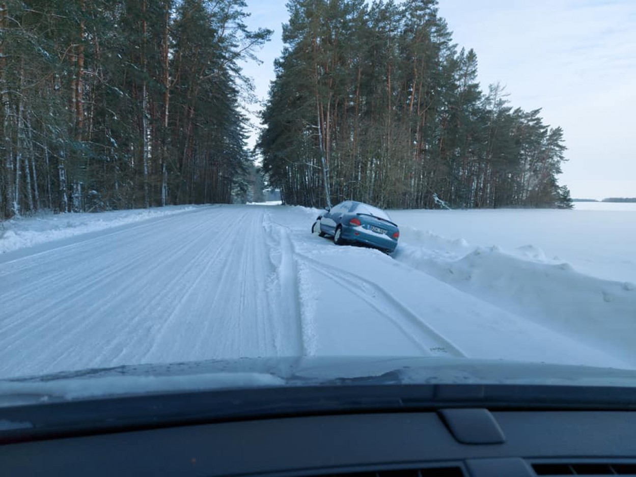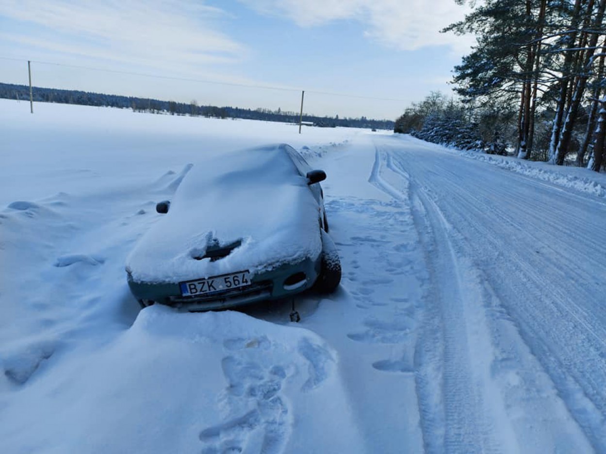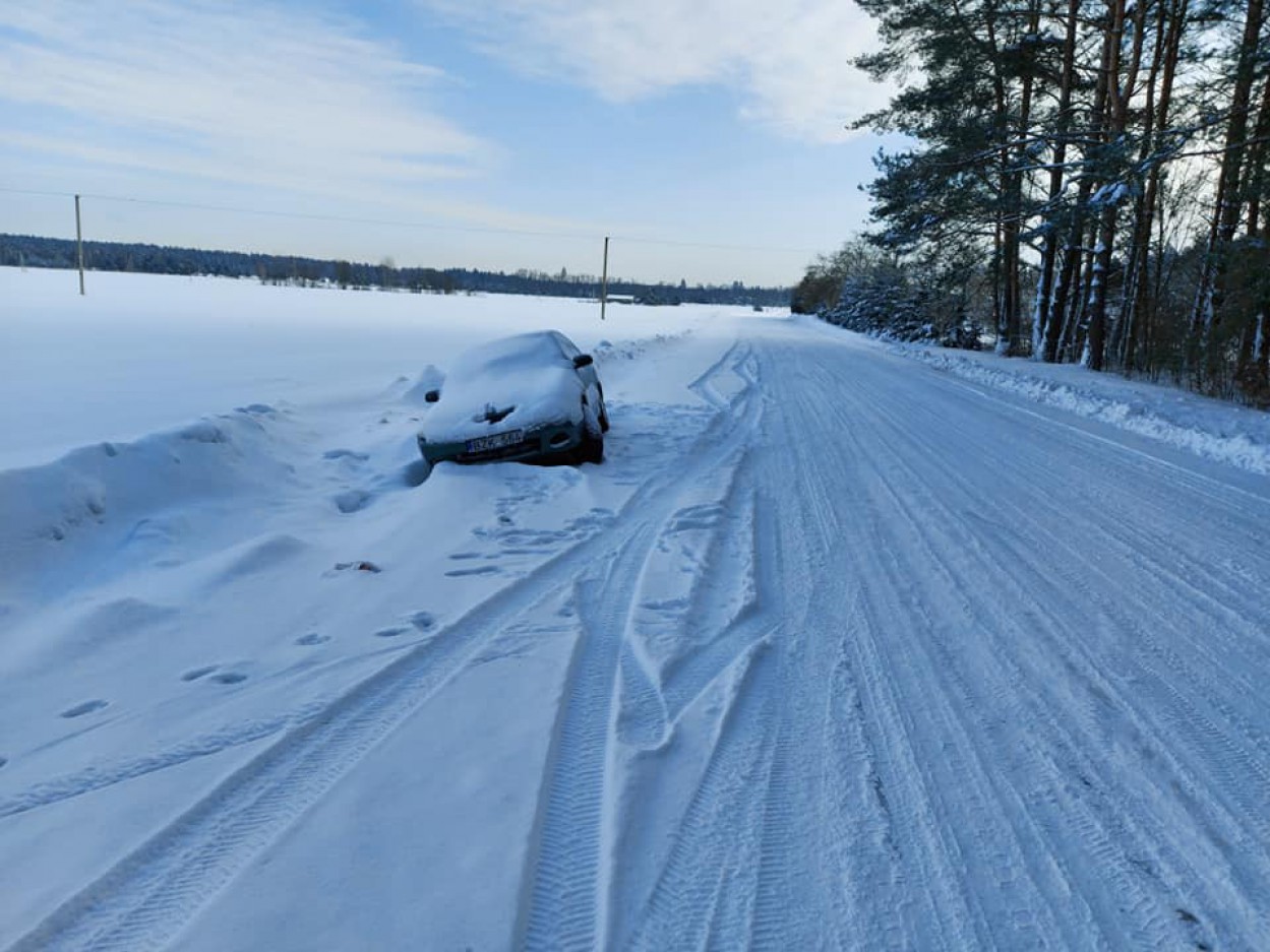 Anot seniūno Valero Mikalaukso, nuo pirmadienio vakaro kelkraštyje užstrigęs lengvasis automobilis trukdo kelio valymo darbams.