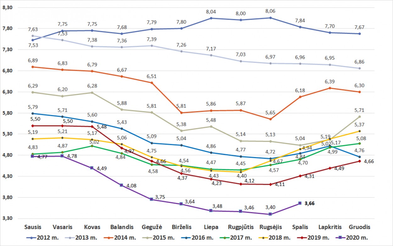 Per metus (2020 m. spalis / 2019 m. spalis) biokuro kaina mažėjo 15,65 proc., gamtinių dujų – 15,52 proc.