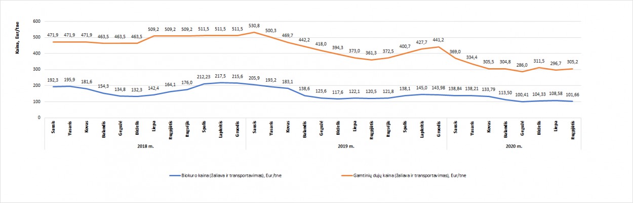 Centralizuotai tiekiamos šilumos kainos pokyčius iš esmės lemia kuro ir superkamos šilumos kainos. Į 2020 m. spalio mėn. šilumos kainas įskaičiuota vidutinė 2020 m. rugpjūčio mėn. biokuro (žaliavos kartu su transportavimu) kaina – 101,66 Eur/tne yra 6,37 proc. mažesnė nei į rugsėjo mėn. šilumos kainas įskaičiuota vidutinė 2020 m. liepos mėn. biokuro kaina (108,58 Eur/tne).