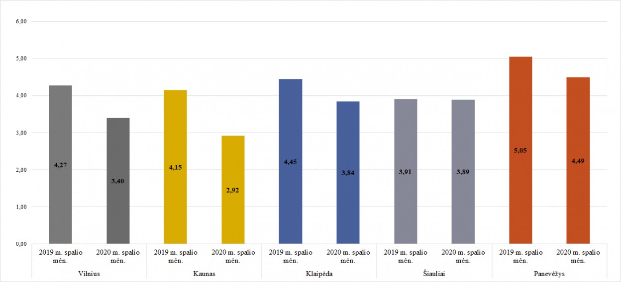 Spalio mėn., palyginus su rugsėjo mėn., AB „Panevėžio energija" aptarnaujamiems vartotojams šilumos kaina nesikeičia (2020 m. spalio mėn., palyginus su 2019 m. spalio mėn., kaina mažėja 11,09 proc.). AB „Šiaulių energija" aptarnaujamiems vartotojams šilumos kaina didėja 3,18 proc. (2020 m. spalio mėn., palyginus su 2019 m. spalio mėn., kaina mažėja 0,51 proc.), AB „Vilniaus šilumos tinklai" aptarnaujamiems vartotojams – 13,45 proc. (2020 m. spalio mėn., palyginus su 2019 m. spalio mėn., kaina mažėja 20,37 proc.), AB „Kauno energija" aptarnaujamiems vartotojams – 14,53 proc. (2020 m. spalio mėn., palyginus su 2019 m. spalio mėn., kaina mažėja 29,64 proc.), AB „Klaipėdos energija" aptarnaujamiems vartotojams – 22,65 proc. (2020 m. spalio mėn., palyginus su 2019 m. spalio mėn., kaina mažėja 13,71 proc.).