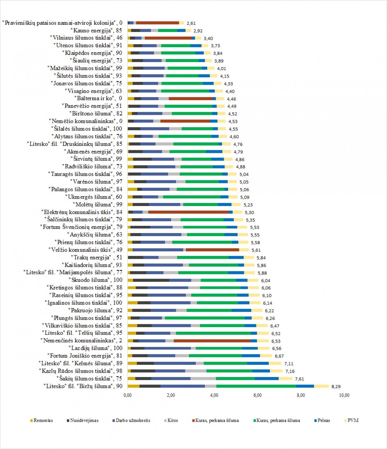 4 pav. pateikiamas centralizuotai tiekiamos šilumos kainų palyginimas pagal Tarybos licencijuojamus šilumos tiekėjus. Skaičiai prie šilumos tiekėjo pavadinimo rodo, kokią dalį (proc.) kuro struktūroje sudaro atsinaujinantys energijos ištekliai, įvertinant tiek šilumos tiekėjo gaminamą, tiek iš nepriklausomų šilumos gamintojų perkamą šilumą, pagamintą naudojant atsinaujinančius energijos išteklius (žaliai pažymėti kuro dedamosios stulpeliai rodo, kad daugiau nei 50 proc. šilumos pagaminama iš atsinaujinančių energijos išteklių, rudai – daugiau nei 50 proc. šilumos pagaminama naudojant gamtines dujas).