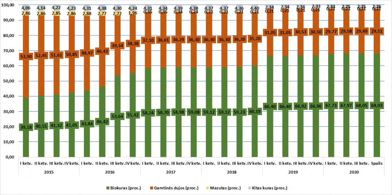 Gamtinių dujų dalis bendroje šilumos gamybai naudojamo kuro struktūroje tolygiai mažėja. 2019 m., palyginti su 2018 m., šilumos energijai gaminti naudojamo kuro struktūroje gamtinių dujų dalis mažėjo 5,2 procentinio punkto – nuo 36,0 proc. iki 30,8 proc., o biokuro dalis augo 7,3 procentinio punkto – nuo 59,4 proc. iki 66,7 proc. 2020 m. spalio mėn. šilumos gamybai naudojamo kuro struktūroje biokuras sudaro 68,03 proc., gamtinės dujos – 29,51 proc.