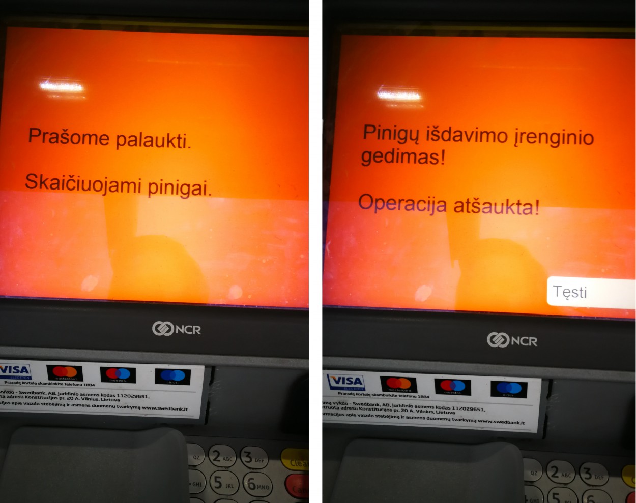 „Vakar, atlikusi visas reikiamas procedūras - suvedus PIN kodą, įvedus reikiamą pinigų išėmimo sumą ir atgavus kortelę, laukiau, kol bus išduotos lėšos. Tai tvirtino ir bankomato ekrane esantis užrašas "Prašome palaukti. Skaičiuojami pinigai". Tačiau po kurio laiko ekrane pasirodė užrašas "Pinigų išdavimo įrenginio gedimas. Operacija atšaukta". Kelias minutes buvo išties baugu, mat atrodė, jog lėšos nuo sąskaitos nurašytos, tačiau pinigai taip ir neišduoti. Laimei, gauta SMS žinutė apie lėšų gražinimą į sąskaitą, tačiau tos kelios akimirkos nebuvo malonios. Viešindama šią istoriją noriu tik perspėti kitus gyventojus, kad taip atsitikus – nepanikuotų. Pinigai į sąskaitą buvo gražinti, tačiau kelis žilus plaukus sau „užsidirbau“, - pasakojo moteris.