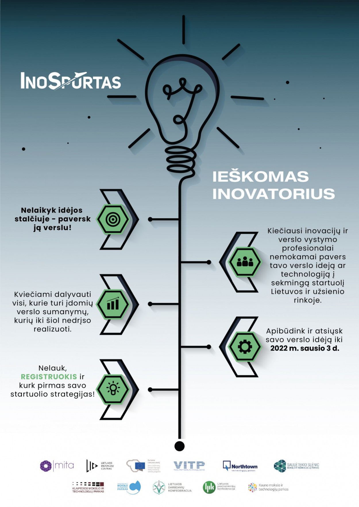 „Laukiame visų, turinčių idėjų, nepraleisti galimybės ir su ekspertų pagalba sukurti visiškai naują arba iš esmės patobulinti jau egzistuojantį produktą, sprendžiantį visuomenės, mokslo ar verslo problemas ir taip gerinantį mūsų kasdienybę“,- dalyvauti ragina MITA projekto „InoSpurtas“ vadovė Jolita Razumienė. Konkurso dėka sėkmingai įsteigta jau 60 technologinių įmonių, kuriančių inovatyvius, aukštos pridėtinės vertės produktus.