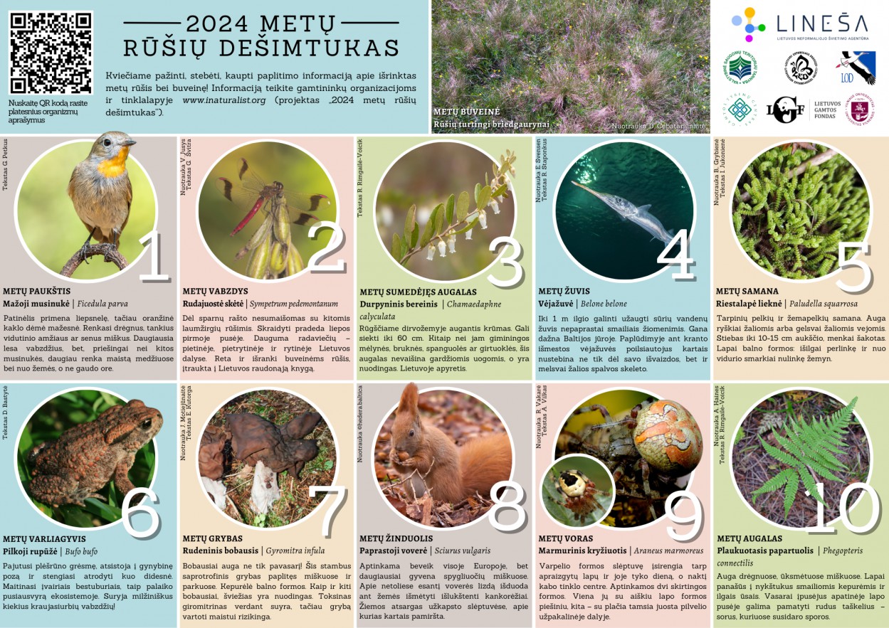 Į dešimtuką pateko rūšys, į kurias gamtininkai nori atkreipti visuomenės dėmesį ir surinkti daugiau informacijos 2024-aisiais metais. Lietuvos gamtininkai tikisi, kad ir mūsų šalies mokiniai, mokytojai, kiti gamtos bičiuliai įsitrauks į gamtos stebėjimus ir piliečių mokslo projektus.