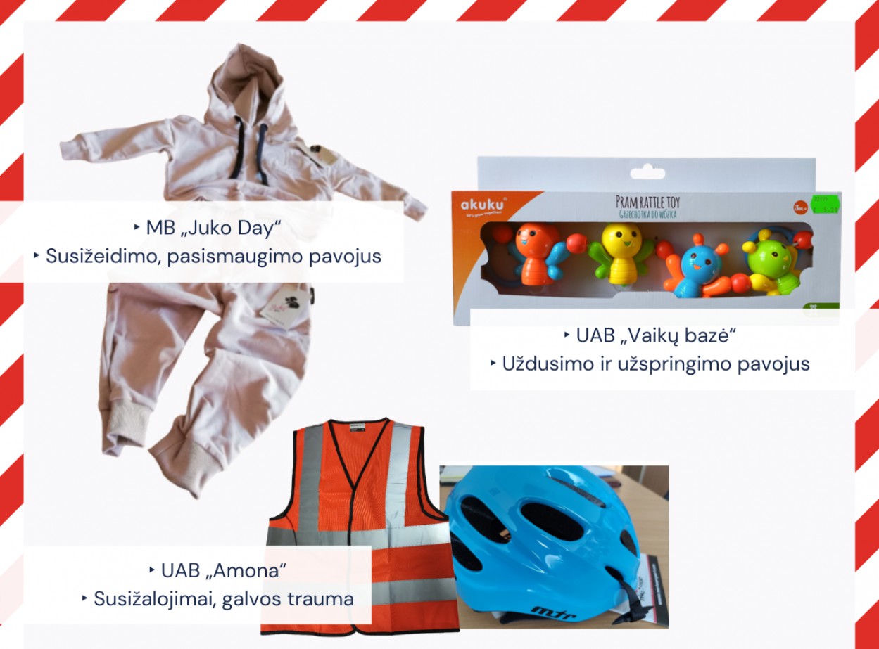 Valstybinė vartotojų teisių apsaugos tarnyba išnagrinėjo bylas dėl į rinką teiktų pavojingų produktų – vaikiško laisvalaikio kostiumo, šalmo, vaikiškos liemenės ir barškučio , kuriuos į rinką teikė MB „Juko Day“, UAB „Amona“ ir UAB „Vaikų bazė“.