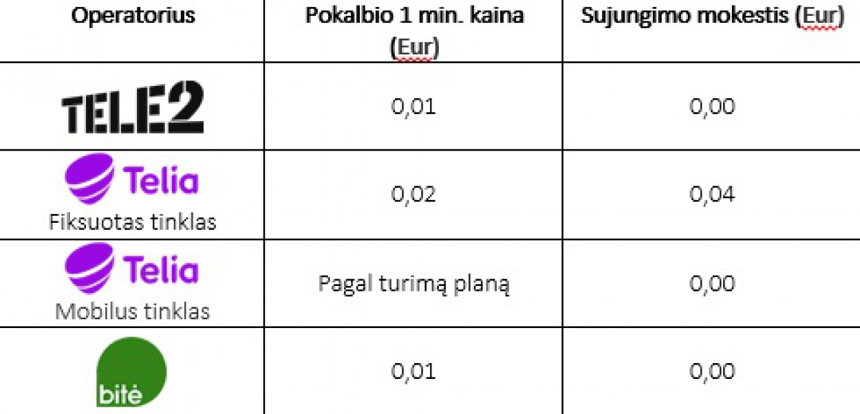 Kiek kainuoja skambinti trumpuoju numeriu 1883 - pateikta lentelėje.