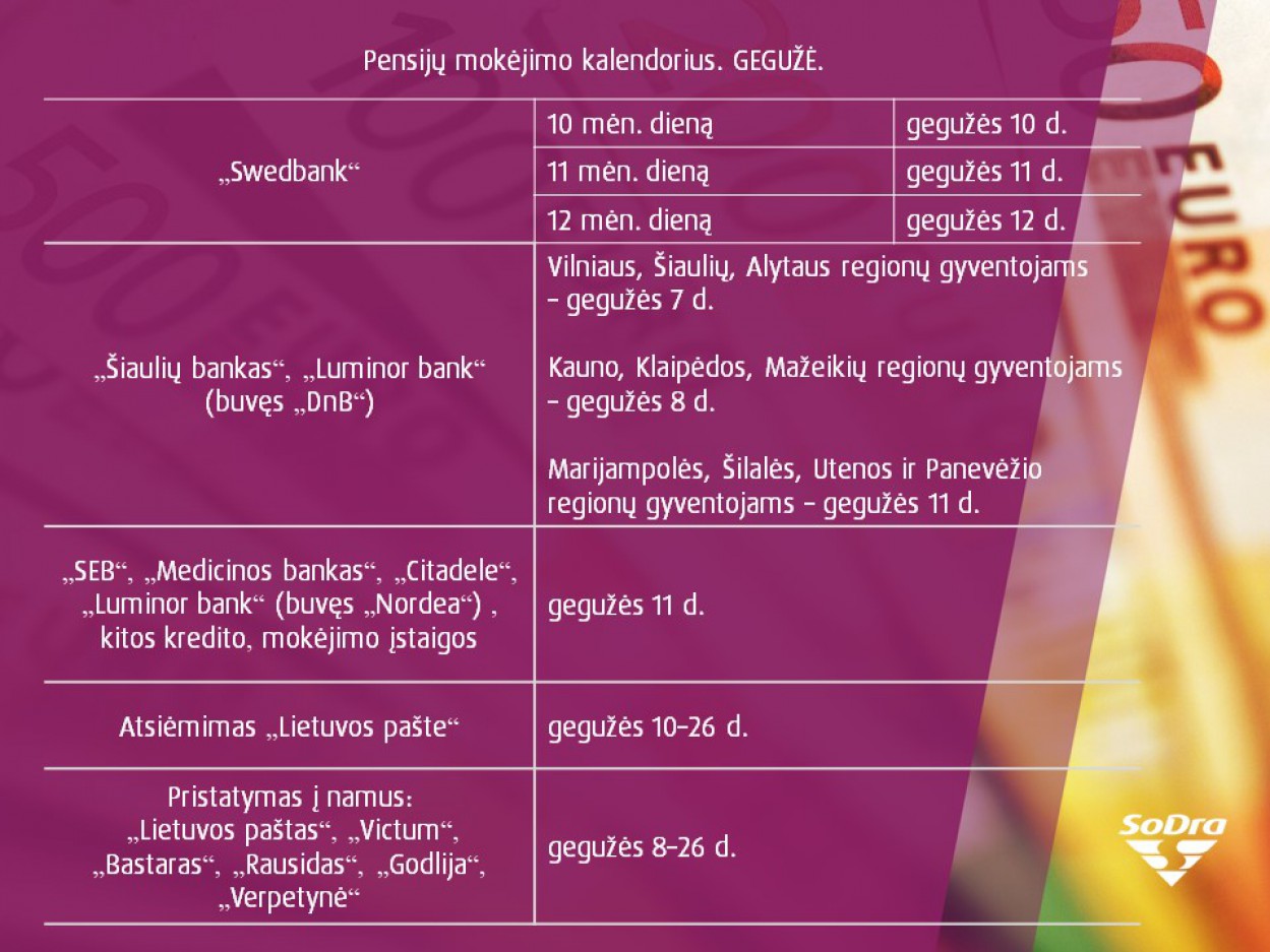 Kitos – ligos, motinystės socialinio draudimo išmokos bei pensijos gyventojams gegužę taip pat mokamos pagal nustatytą grafiką.