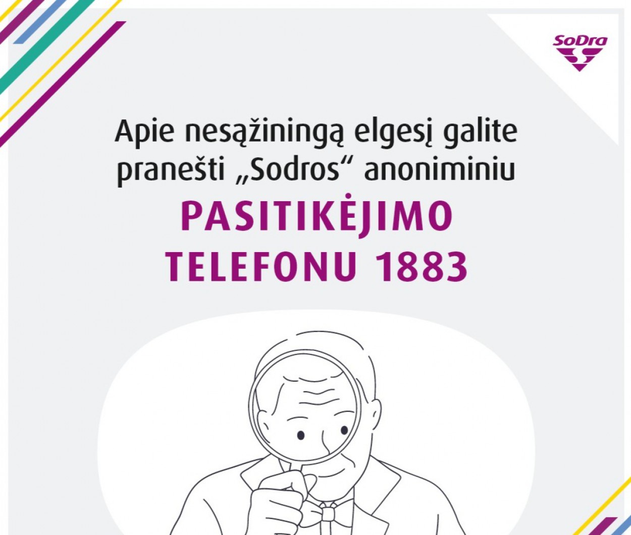 Jei savo aplinkoje ar „Sodros“ darbuotojų veikloje matote galimų pažeidimų ar piktnaudžiavimo atvejų, susijusių su „Sodros“ veikla, apie juos galite pranešti anoniminiu pasitikėjimo telefonu 1883 arba elektroninio pašto adresu antikorupcija@sodra.lt. Anoniminė pasitikėjimo linija kuria saugią aplinką pranešėjams – jiems nereikia atskleisti jokių savo asmens duomenų ar baimintis pasekmių.
