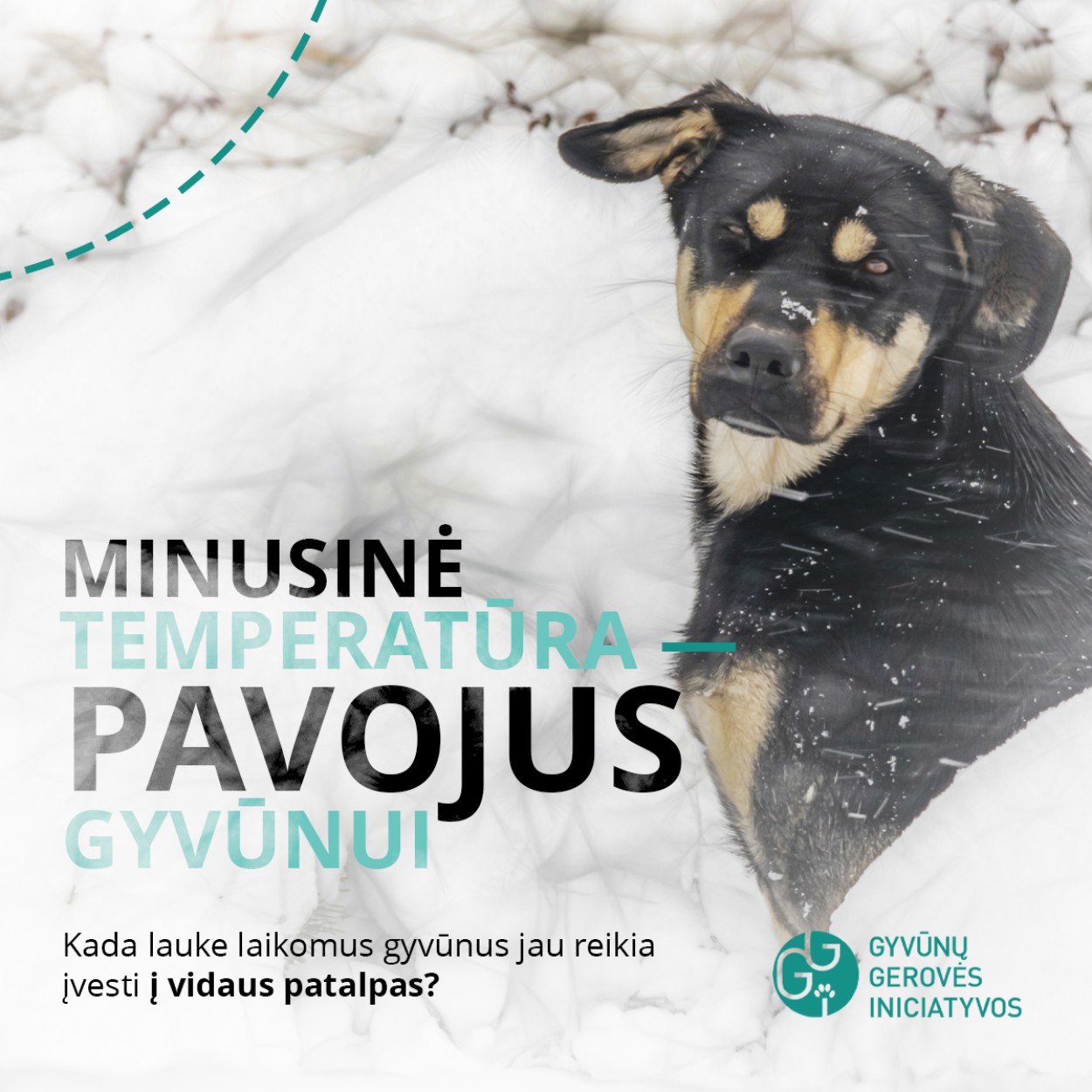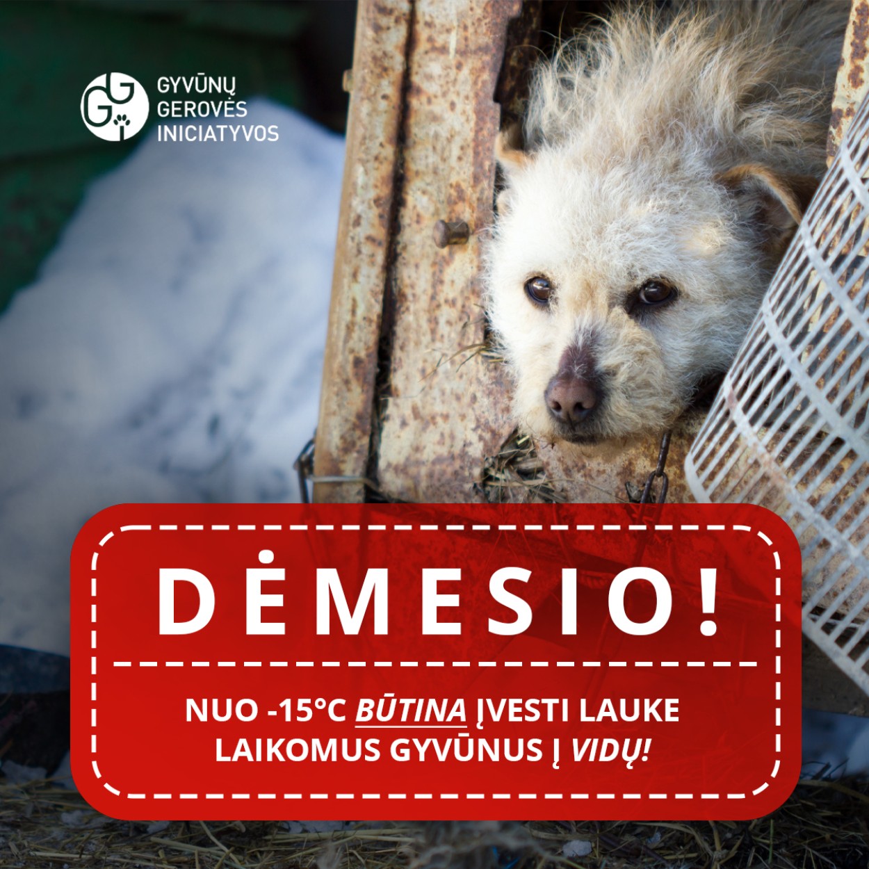 Nevyriausybinės organizacijos „Gyvūnų gerovės iniciatyvos“ specialistai primena, kad temperatūrai nukritus žemiau -15 reikia įleisti lauke gyvenančius šunis ir kates į vidaus patalpas, nes kitaip yra rizikuojama gyvūno sveikata ar net gyvybe.