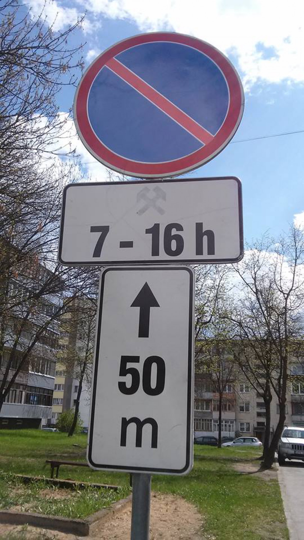„Norėtumėm viešai pasidalinti žinia apie naują kelio ženklą Kosmonautų gatvėje. Tai – kuriozas. Daugiabučio namo kieme staiga atsirado ženklas, draudžiantis prie namo kieme nuo 7 val. ryto iki 16 val. statyti automobilius.
