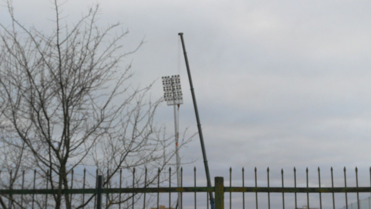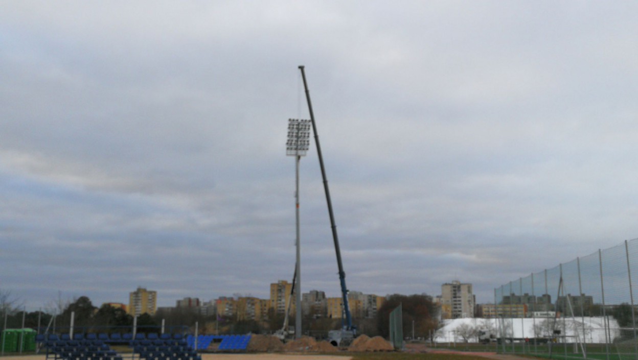 Šiandien į stadioną atkeliavo ir pradėti montuoti 4 stulpai. Kiekvienas jų – 40 metrų aukščio ir turi po 48 šviestuvus.
