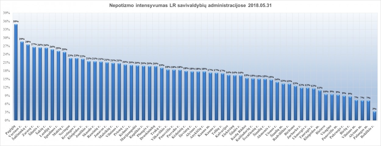 Mažiausias nepotizmo intensyvumas nustatytas Rokiškio r. (3 proc.) ir Vilniaus m., Alytaus m. bei Palangos m. savivaldybėse (po 7 proc.).