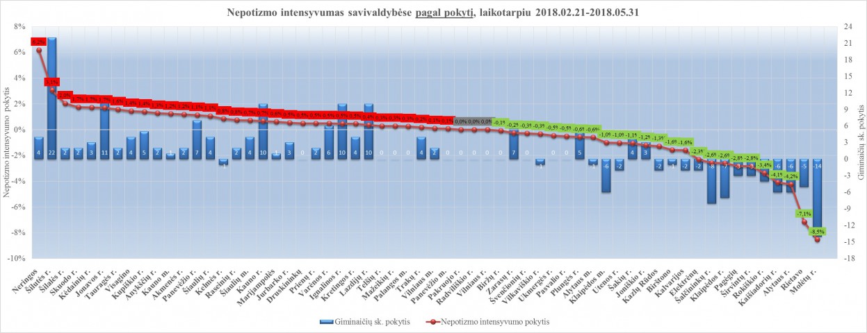 Savivaldybių administracijose pastebimos skirtingos nepotizmo intensyvumo pokyčių tendencijos. Per analizuotą laikotarpį nepotizmo intensyvumas augo 32 savivaldybėse, 25 savivaldybėse sumažėjo, o 3 – išliko toks pat. Labiausiai nepotizmas išaugo Neringoje (+6,2 proc.), Šilutės r. (+3,1 proc.) ir Šilalės r. (+2 proc.). Jonavos savivaldybėje nepotizmo intensyvumas augo 1,7 proc. , kai per 3 mėn. savivaldybėje buvo įdarbinta 11 asmenų, kurie susiję giminystės ryšiais.