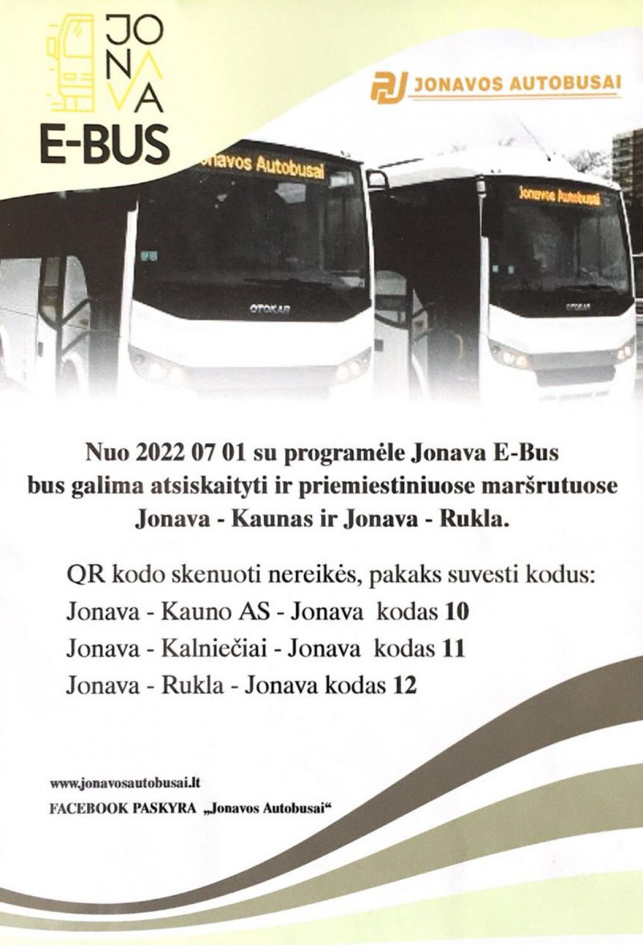 Kaip yra žinoma, „Jonavos autobusuose“ naujas atsiskaitymo būdas už bilietus įdiegtas 2021 -ųjų rugsėjį. Nuo tos dienos keliaujant bendrovės „Jonavos autobusai“ transportu MIESTE, keleiviai bilietą pirkdavo nuskaitant autobuse esantį QR kodą arba mobiliojoje programėlėje „Jonava E-Bus“ įvedus kodą: 111.