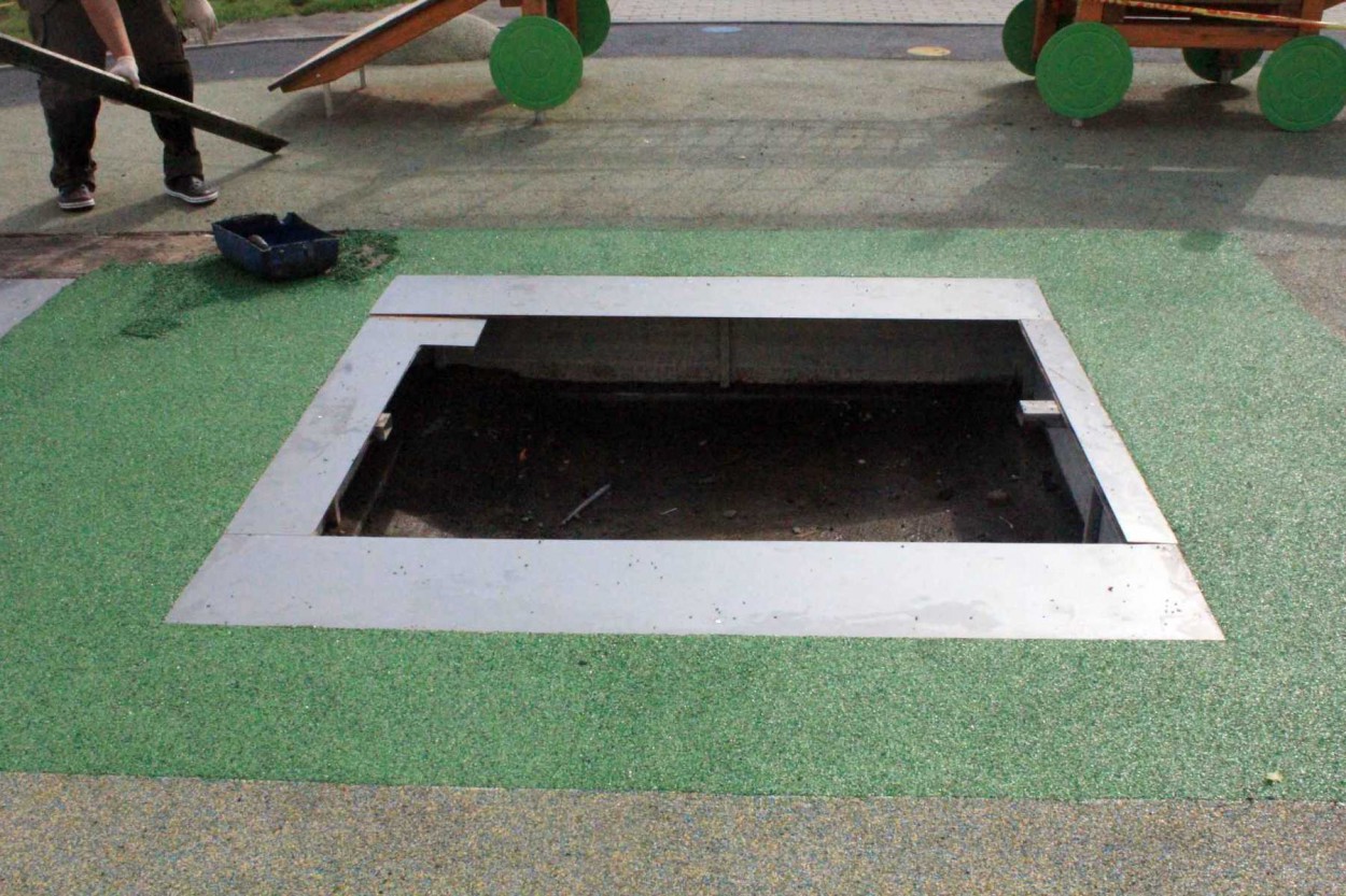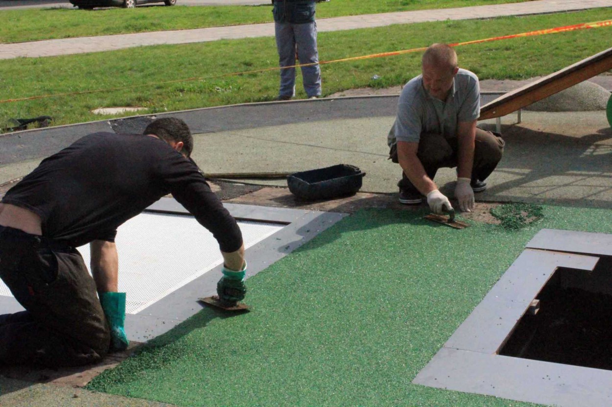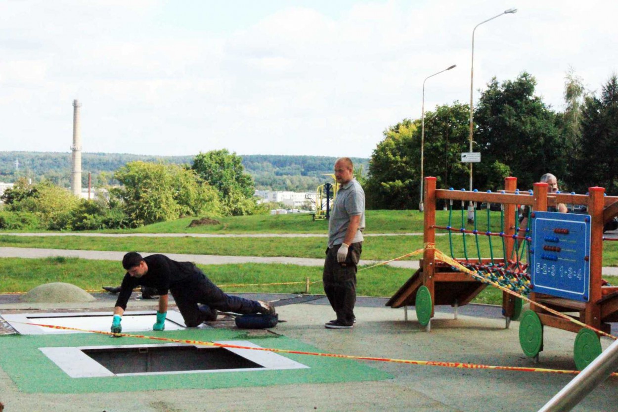 Antradienį pradėta tvarkyti vaikų žaidimų aikštelė Chemikų gatvėje. Prieš kelis mėnesius supjaustyti antžeminiai batutai keičiami naujais.
