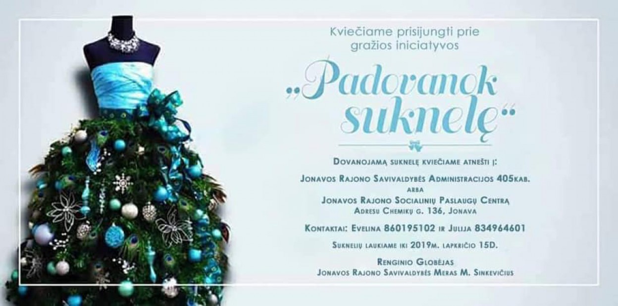 Pernai metais, tarpinstitucinio bendradarbiavimo koordinatorė Jonavoje Evelina Darvidė kartu su kitomis rajono įstaigomis surengusi pirmąją akciją „Padovanok suknelę“, šiemet vėl kviečia nebūti abejingais ir prisijungti prie šios prasmingos idėjos – dovanokite sukneles, batelius, papuošalus kitoms – vargstančioms dailiosios lyties atstovėms.