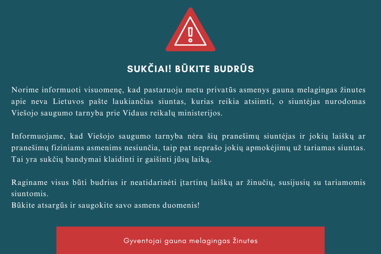 Norime informuoti visuomenę, kad pastaruoju metu privatūs asmenys gauna melagingas žinutes apie neva Lietuvos pašte laukiančias siuntas, kurias reikia atsiimti, o siuntėjas nurodomas Viešojo saugumo tarnyba prie Vidaus reikalų ministerijos.