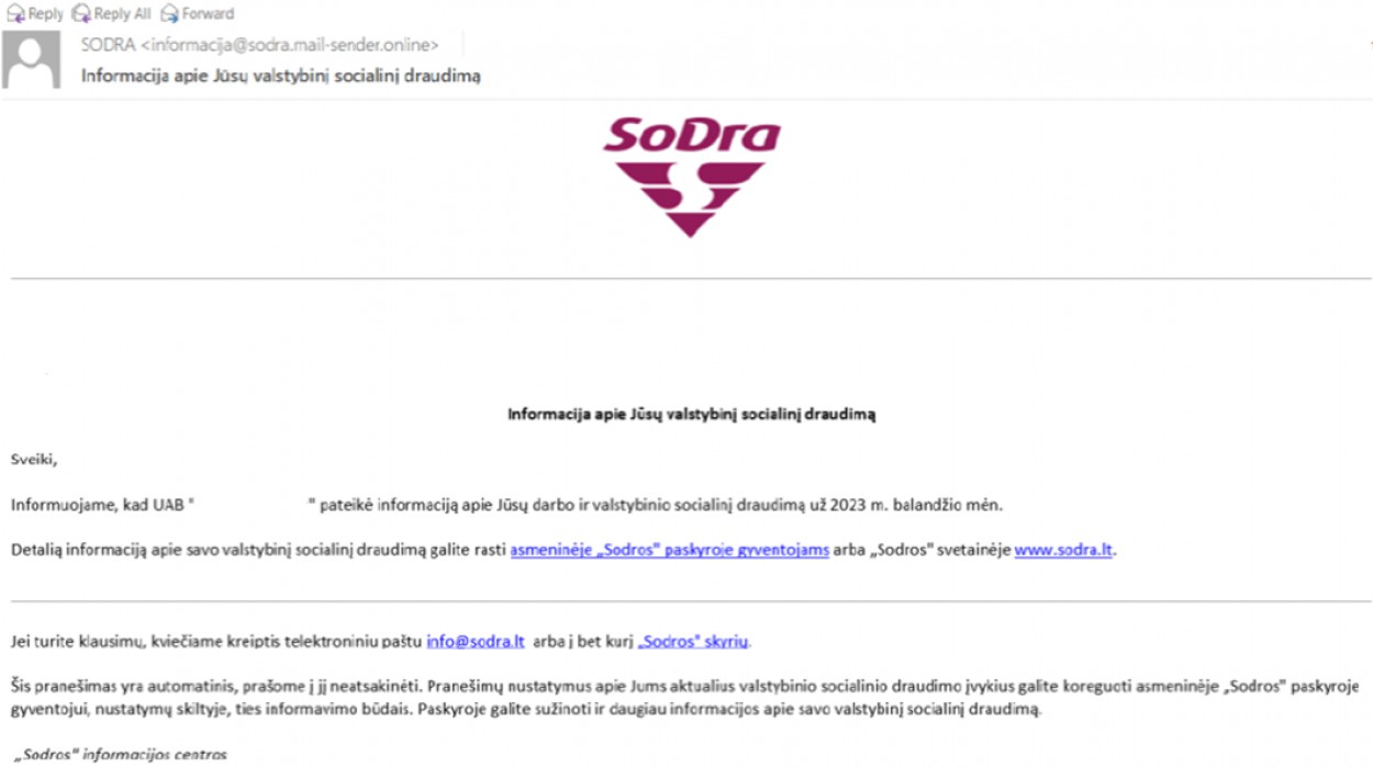Į gyventojų elektroninio pašto dėžutes atkeliauja sukčių laiškai, siunčiami „Sodros“ vardu. Nieko bendro su „Sodra“ šie pranešimai neturi – svarbu nespausti jokių juose esančių nuorodų.